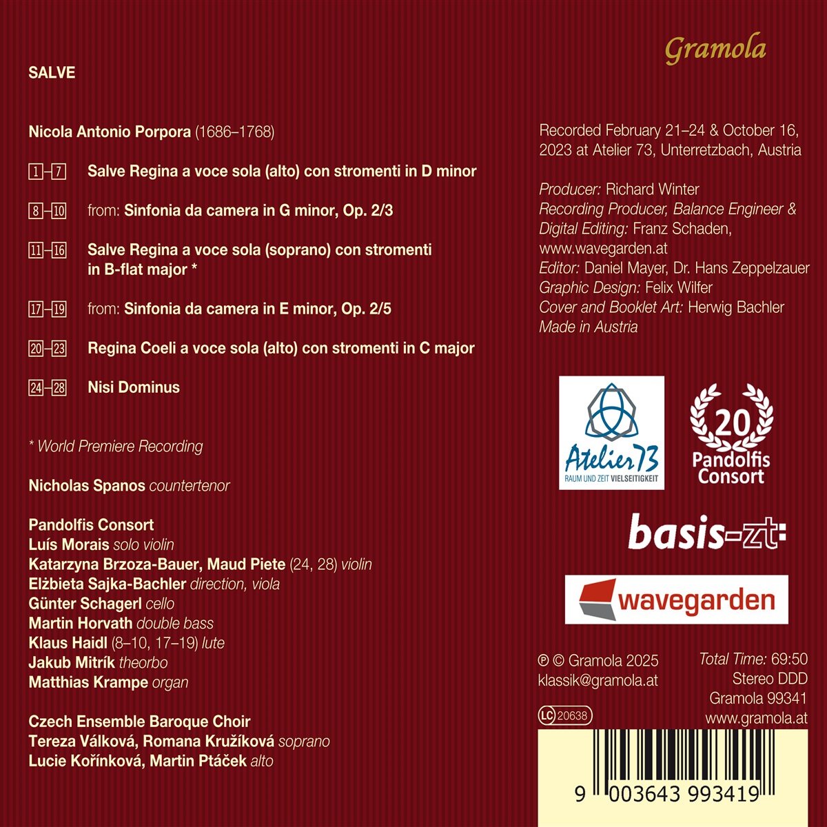 Das Pandolfis Consort, der Countertenor Nicholas Spanos und der Czech Ensemble Baroque Choir präsentieren auf diesem Album unter dem Titel „Salve“ Werke des aus Neapel stammenden Komponisten Nicola Antonio Porpora. Die Musik dieses Albums formt dabei ein imaginäres Konzertprogramm: Im ersten Teil finden sich drei Marienantifonen, die mit ein paar Jahre früher in London komponierten einleitenden und verbindenden einzelnen Sonatensätzen umrahmt sind. Den zweiten Teil bildet der Psalm 127 „Nisi Dominus“. Beide Teile entsprechen der Musik, die von Porpora zum Fest Mariä Himmelfahrt für das Ospedaletto in Venedig 1744 komponiert wurde. Allen Vokalstücken gemein ist die Konzentration auf die klangvolle erhebende Stimme mit unendlichen Koloraturen, die virtuose Partie der ersten Violine und in einem Fall mit dem Gegenpart des Chores, der hier solistisch besetzt ist. Diese Reduktion auf das Wesentliche, auf solistisches Instrumentarium, auf den Kern der Musik, ist seit vielen Jahren der Fokus des von der Violistin Elżbieta Sajka-Bachler gegründeten Pandolfis Consort, das auf historischen Instrumenten spielt.