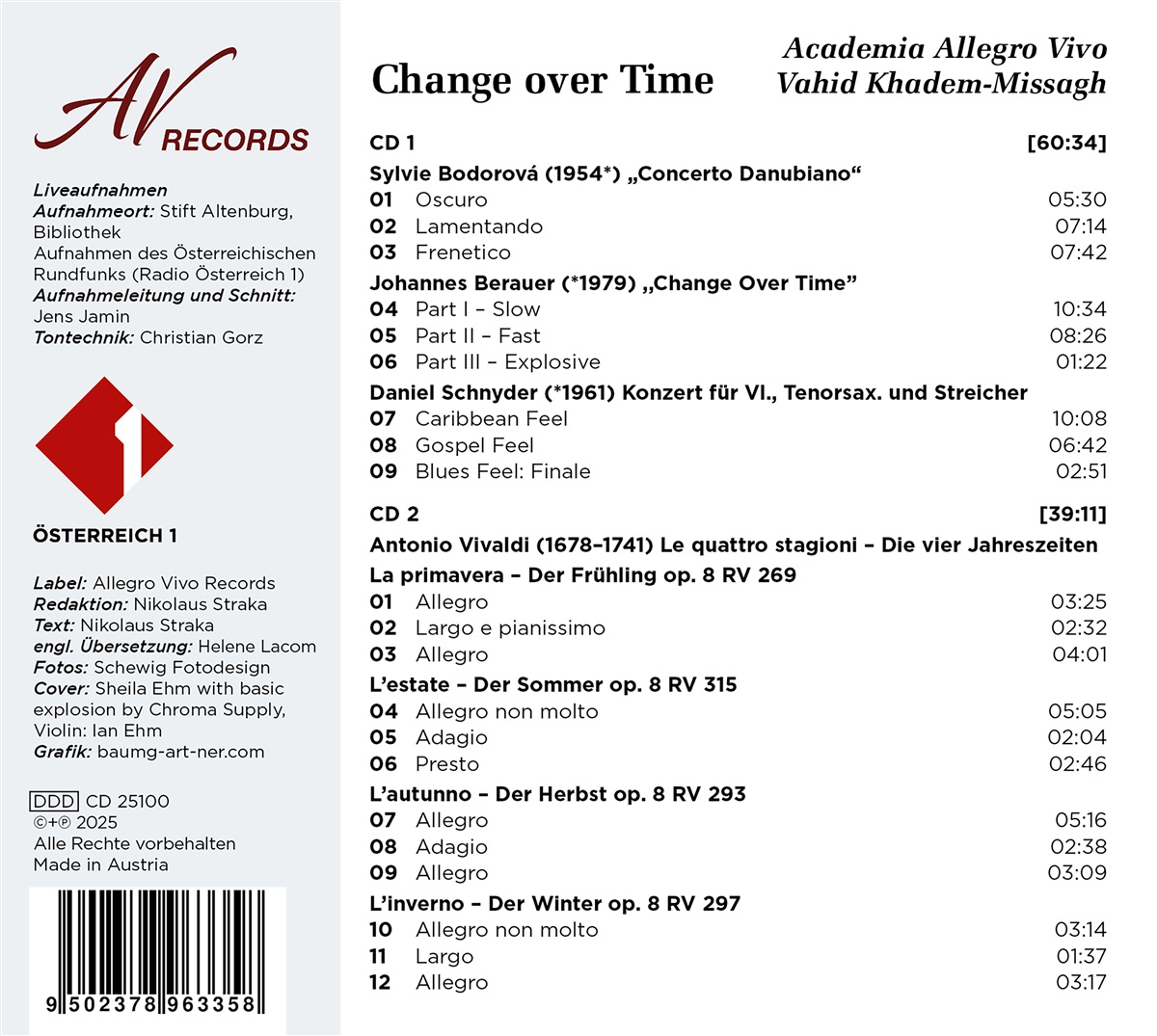 Dieses Album spannt einen faszinierenden musikalischen Bogen über 300 Jahre Musikgeschichte: Antonio Vivaldis 'Vier Jahreszeiten' stehen im Dialog mit Werken dreier zeitgenössischer Komponist*innen, die das Klangspektrum unserer Zeit in besonderer Weise erkunden. Die vorliegenden Aufnahmen sind Live-Mitschnitte aus den jüngsten Eröffnungskonzerten des Allegro Vivo Festivals. Dabei begeben sich Geiger Vahid Khadem-Missagh und das Residenz-Kammerorchester jeweils in einen Dialog mit einem zweiten Soloinstrument. Die Begegnungen umfassen Violine und Percussion bei Sylvie Bodorova (UA 2024), Violine und Akkordeon bei Johannes Berauer (UA 2023) und Violine und Tenorsaxophon bei Daniel Schnyder (UA 2022).