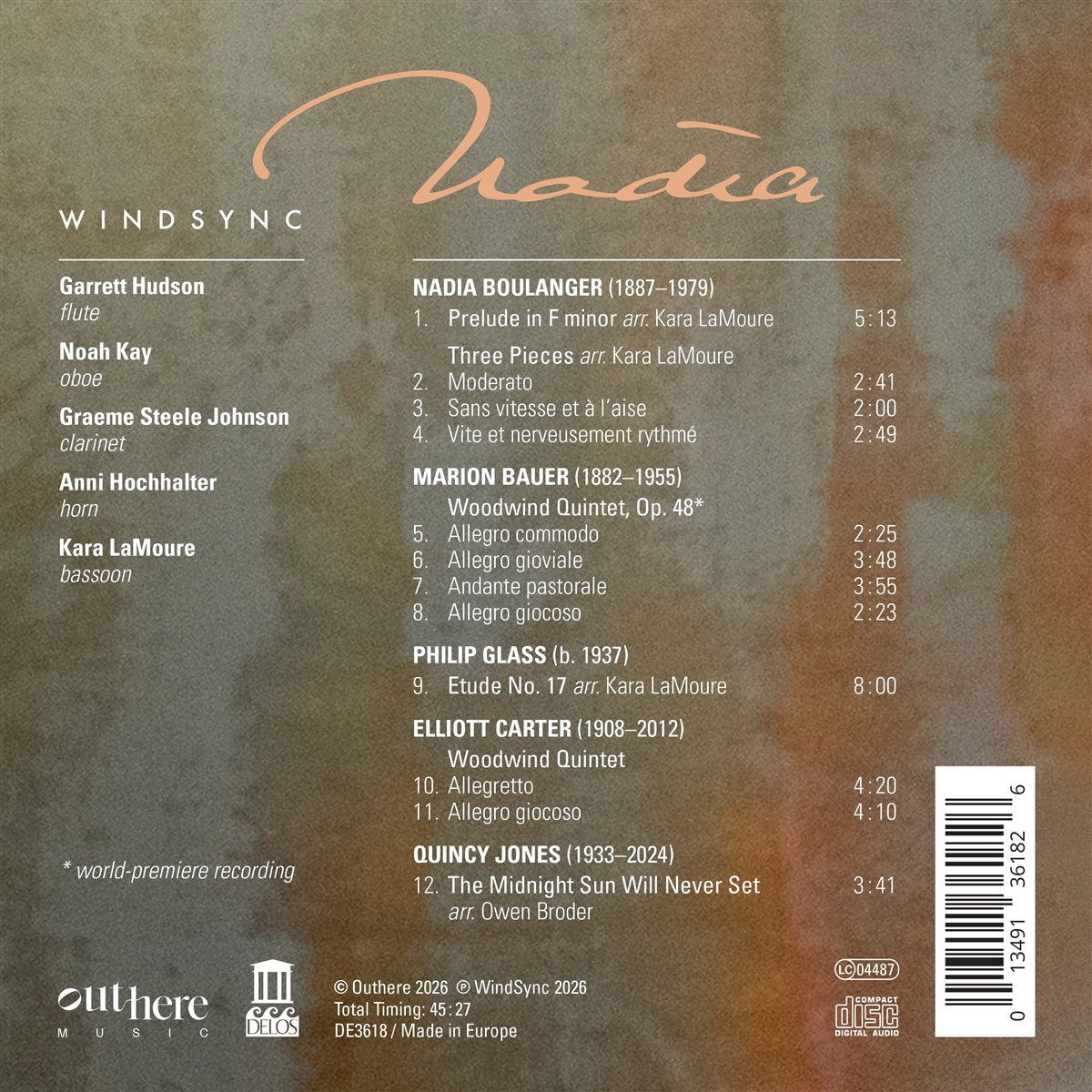 Nach dem begeisterten Echo, das sein Album „Forgotten Sounds“ in der New York Times, Gramophone und BBC Music Magazine ausgelöst hat, kehrt der Klarinettist Graeme Steele Johnson nun gemeinsam mit dem Bläserquintett WindSync zum Label Delos zurück. WindSync gilt als eine der prägenden Kräfte der amerikanischen Kammermusikszene und fühlt sich auf heimischen Bühnen genauso zu Hause wie auf internationalen. Das Ensemble spielt fast ausschließlich eigenes Repertoire, das entweder in Auftrag gegeben oder von den Mitgliedern selbst arrangiert wurde. Auf dieser Einspielung verfolgen die Musiker die stilistische Vielfalt der amerikanischen Musik bis zu einer einzigen Quelle zurück: nicht zu einem Gründervater, sondern zur legendären Nadia Boulanger. Die Komponistin, Dirigentin, Musiktheoretikerin und Kompositionslehrerin hat die amerikanische Musik und ihre Protagonisten nachhaltig geprägt. Die eindrucksvolle Schülerliste dieses Albums spricht für sich: Philip Glass, Elliott Carter, Quincy Jones und Marion Bauer, deren Bläserquintett hier erstmals wiederaufgeführt und eingespielt wurde. Mit Nadia möchte WindSync die Frau hinter dem Mythos beleuchten und erzählt ihre Geschichte durch ein Jahrhundert Musik, die von Nadia Boulanger und ihren Schülern stammt: ein atemberaubend vielfältiges amerikanisches Erbe, das bis heute nachhallt.