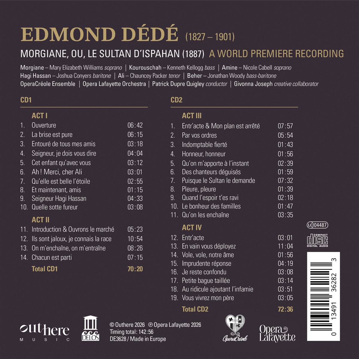Delos präsentiert in Zusammenarbeit mit Opera Lafayette und OperaCréole diese Weltpremieren-Aufnahme der frühesten vollständigen Oper eines schwarzen Amerikaners. Diese Aufnahme ist keine Wiederaufführung – sie ist eine Offenbarung. Mehr als ein Jahrhundert nach ihrer Fertigstellung ist Edmond Dédés Morgiane dank der unermüdlichen Arbeit von Giovonna Joseph, der Gründerin von OperaCréole, dem Dirigenten Patrick Dupre Quigley und vielen anderen endlich zu hören. Der in New Orleans geborene Dédé floh vor einem Leben, das für freie Farbige im Süden der Vereinigten Staaten einer Apartheid glich, um seine Karriere in Frankreich aufzubauen – ein Schritt, der seinen Kompositionsstil stark beeinflusste. In dieser Hinsicht ist die Musik von Morgiane nicht nur wunderschön, sondern schlägt auch eine Brücke zwischen verschiedenen Welten: der amerikanischen und der französischen, der schwarzen und der weißen, der mächtigen und der marginalisierten. Es ist das Werk eines Komponisten, der mit Überzeugung und Brillanz arbeitete, obwohl er befürchtete, dass vielleicht niemand jemals seine Musik hören würde.