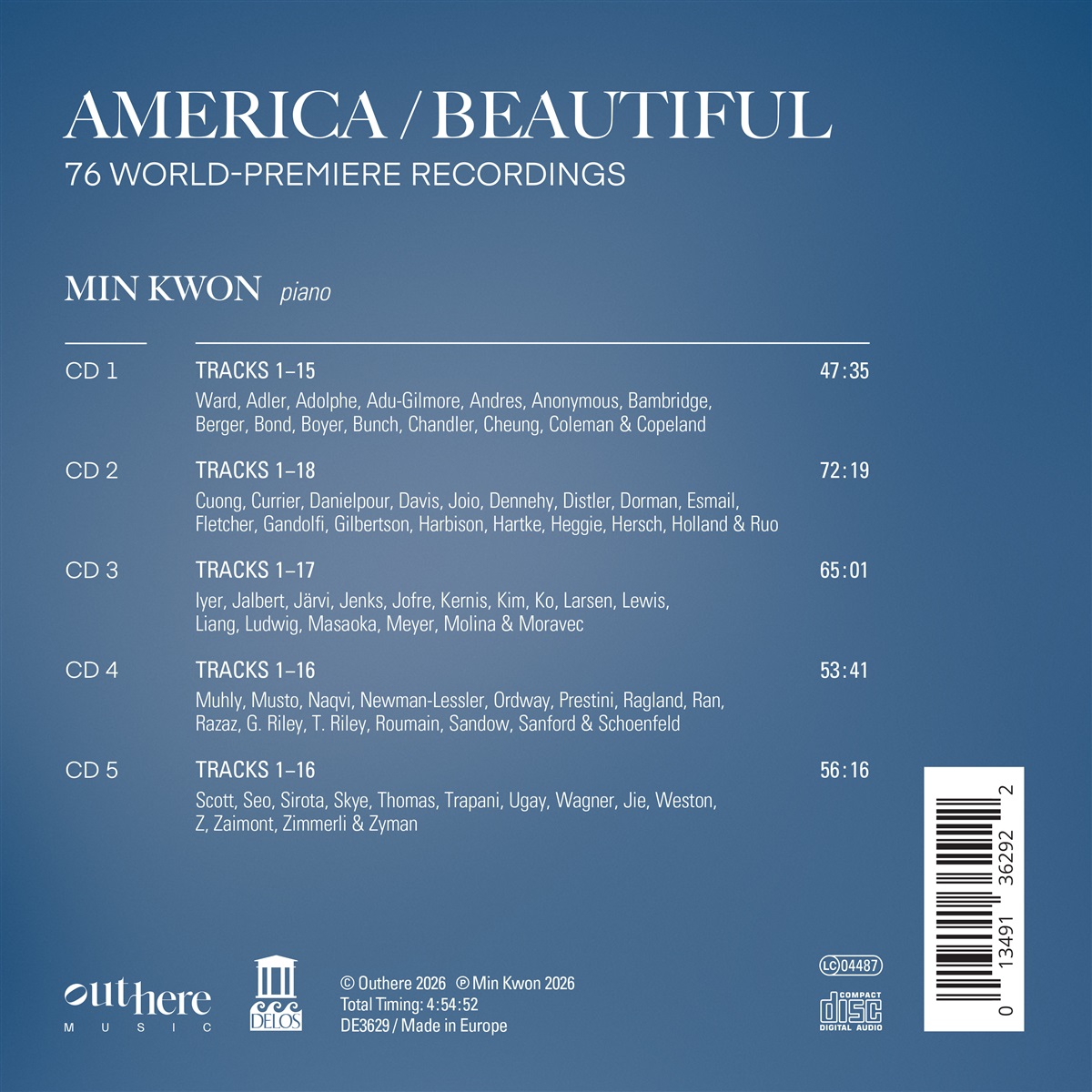 Das Ergebnis ist ein zutiefst bewegendes musikalisches Geflecht – ein klangliches Porträt der Nation in all ihrer Komplexität. In der Gesamtschau entsteht keine stringente Erzählung, sondern ein vielstimmiges Bild: unterschiedliche Perspektiven, die das amerikanische Experiment befragen und neu entwerfen, zusammengehalten durch das Credo E pluribus unum („Aus vielen eines“). Wie Kwon selbst bemerkt: „Trotz aller Schwierigkeiten, vor denen wir stehen, gibt es in diesem Land nach wie vor tiefe Schönheit, Menschlichkeit und Möglichkeiten.“ Als idealer Partner für dieses kühne, ambitionierte und einzigartige künstlerische Vorhaben würdigt Delos mit dieser Edition das 250-jährige Bestehen der Vereinigten Staaten.