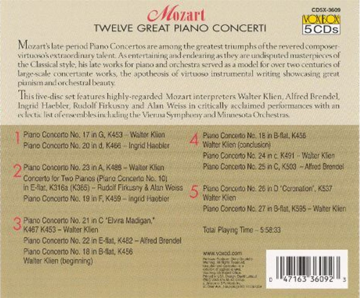 Angerer, Paul / Brendel, Alfred / Firkušný, Rudolf / Haebler, Ingrid / Kehr, Günter / Klien, Walter / Maag, Peter / Mainzer Kammerorchester / Melles, Karl / Minnesota Orchestra / Rochester Philharmonic Orchestra / Skrowaczewski, Stanisław / Vienna Chamber Orchestra / Vienna Pro Musica Orchestra / Orchester der Wiener Volksoper / Weiss, Alan / Wiener Symphoniker / Zinman, David