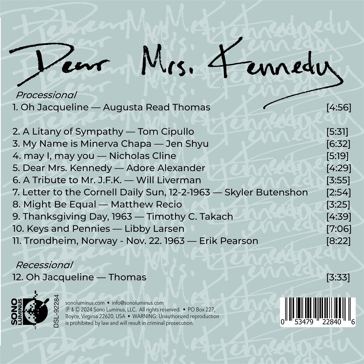 Am 22. November 1963 wurde der US-Präsident John F. Kennedy in Dallas, Texas, ermordet, während er neben seiner Frau Jacqueline Kennedy in einem Auto saß. In den Jahren nach diesem berüchtigten Tag wurden Briefe an Jackie geschrieben, in denen Beileid und Verwirrung zum Ausdruck gebracht wurden, das ganze Spektrum der Trauer, festgehalten in diesen Schriftstücken. Das Projekt „Dear Mrs. Kennedy“ versucht, diesen Briefen eine Stimme zu geben und alle Zuhörer in der Trauer zu vereinen. Anstatt Präsident Kennedy oder First Lady Jackie explizit zu thematisieren, ist die zentrale Figur in dieser Musik die Trauer selbst: die Trauer einer Nation – und einer Welt. Der Tenor Ryan Townsend-Strand und die Pianistin Karina Kontorovitch interpretieren Werke von Augusta Read Thomas, Tom Cipullo, Jen Shyu, Nicholas Cline, Adore Alexander, Will Liverman, Skyler Butenshon, Matthew Reccio, Timothy C Takach, Libby Larsen und Erik Pearson.