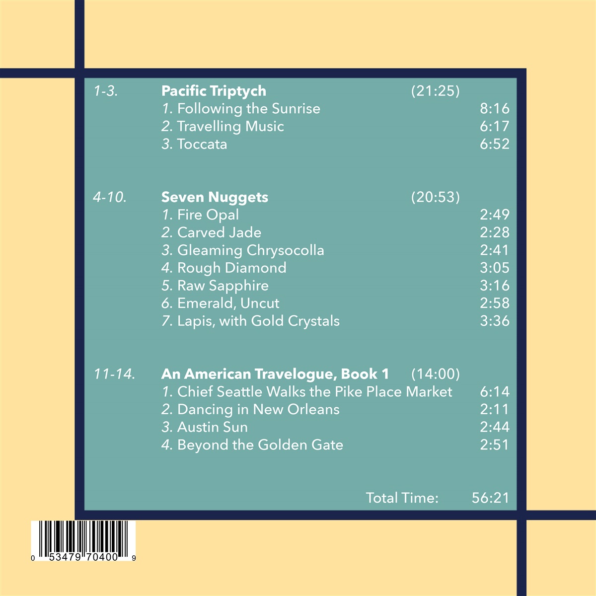Pacific Triptych für Klavier wurde im August 2019 fertiggestellt. Es basiert auf einer früheren, nicht aufgeführten Version für großes Orchester, die 2006 fertiggestellt wurde. Die hier eingespielte Klavierfassung ist somit eine Uraufführung. Wie der Titel andeutet, handelt es sich um eine dreisätzige Partitur, die auf kontrastierenden Abschnitten basiert, die die Majestät der Pazifikküste widerspiegeln, insbesondere die Dramatik des Ozeans und den endlosen Himmel darüber. Seven Nuggets wurde am 25. April 2023 fertiggestellt. Das Werk wurde von einer Gruppe ungeschliffener, aber brillanter Edelsteine inspiriert. Jeder „Nugget“ oder Satz endet mit einer tiefen Bassnote. Dieselben Noten werden dann in der Reihenfolge - in mittlerer Lage - am Ende des siebten Nuggets gespielt, bevor sie in den letzten neun Takten von in einen Sextakkord aufgelöst werden.