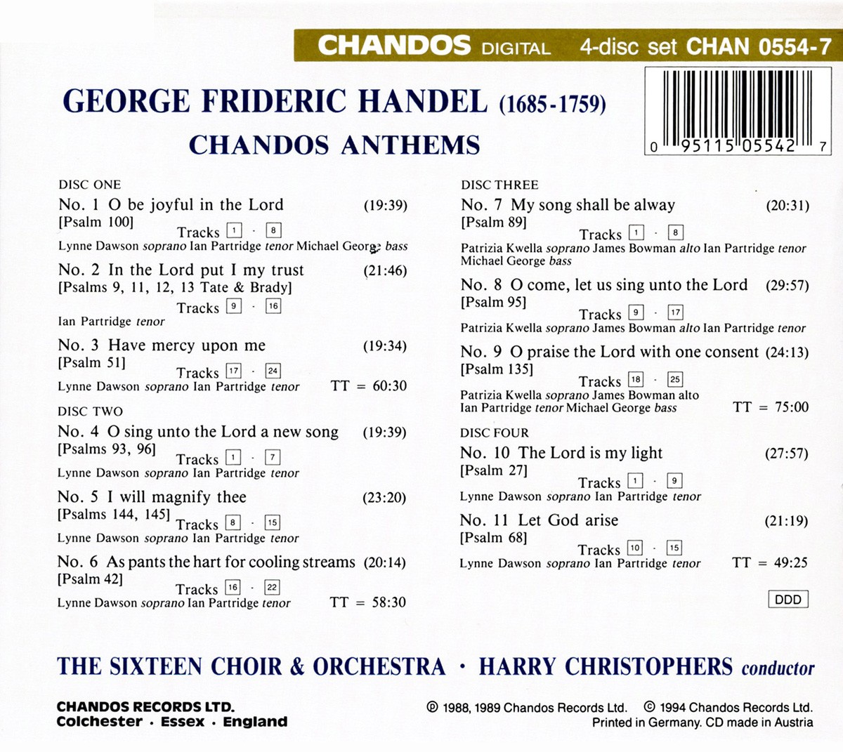 Bowman, James / Christophers, Harry / Darke, Valerie / Dawson, Lynne / George, Michael / Kwella, Patrizia / McKenna, Sophia / Miller, Julie / Partridge, Ian / The Sixteen Orchestra / The Sixteen / Thorp, William / Woodcock, David