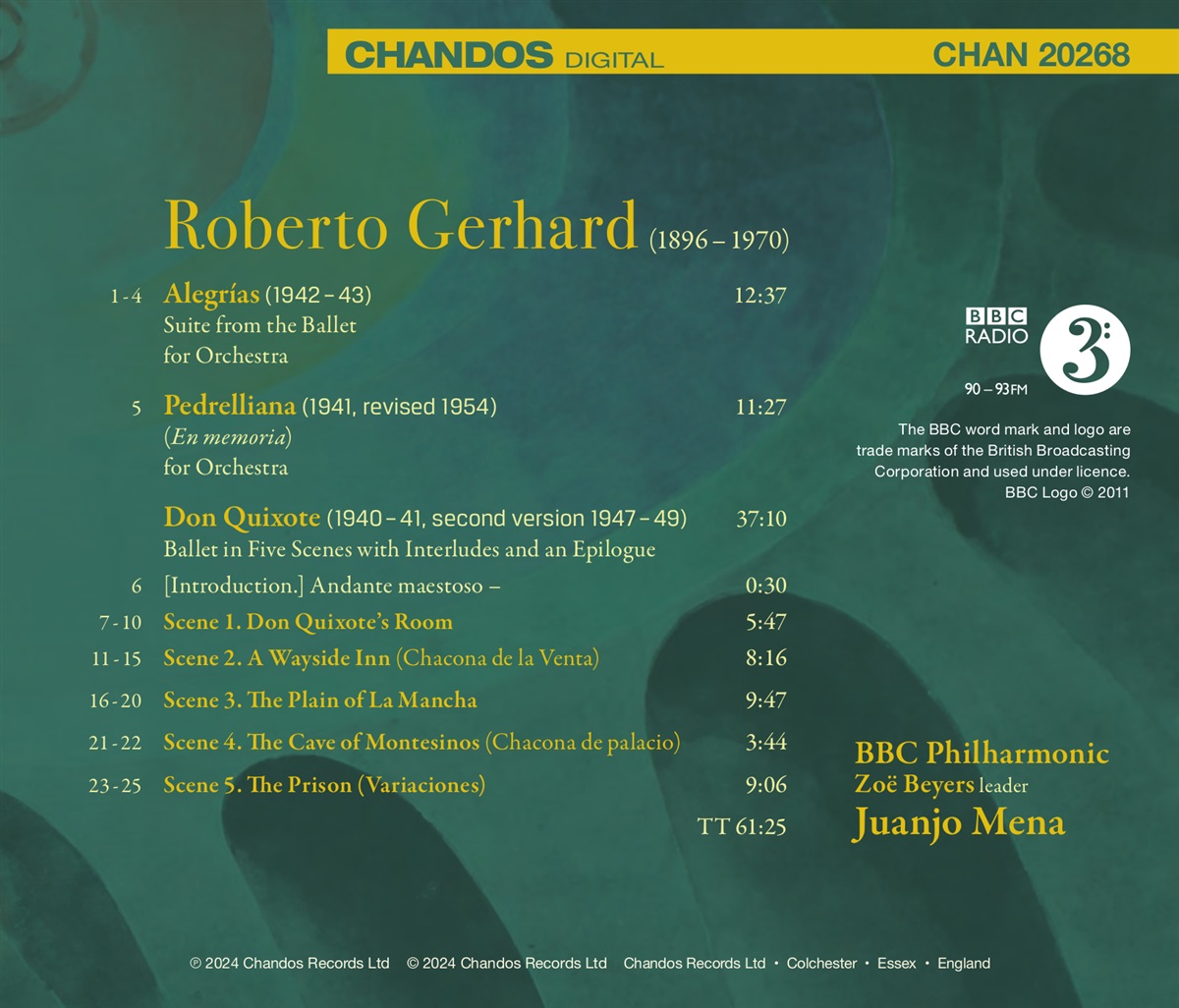 Der Katalane Roberto Gerhard war der einzige spanische Komponist, der bei Arnold Schoenberg studierte. Es dauerte jedoch über zwanzig Jahre, bis er sich der Zwölftonmusik zuwandte. In der Zwischenzeit brachte sein Schaffen einen neuen Fokus und eine neue Präzision in den spanischen Stil, die eher auf Strawinsky und Bartók zurückzuführen ist. Alle Werke auf diesem Album wurden in dieser Zeit komponiert. Das aus den frühen 1940er Jahren stammende Ballett Alegrías war ursprünglich für zwei Klaviere konzipiert, entwickelte sich aber bald zu der hier zu hörenden viersätzigen Suite. Mit „Pedrelliana“ ehrt er seinen ersten Lehrer Felipe Pedrell zu dessem hundertsten Geburtstag. Gerhards Ballett über Episoden aus Cervantes' Don Quijote entwickelte sich fast ein Jahrzehnt lang, von einem Werk für Kammerorchester bis hin zu der hier aufgenommenen vollständigen und endgültigen Orchestrierung.