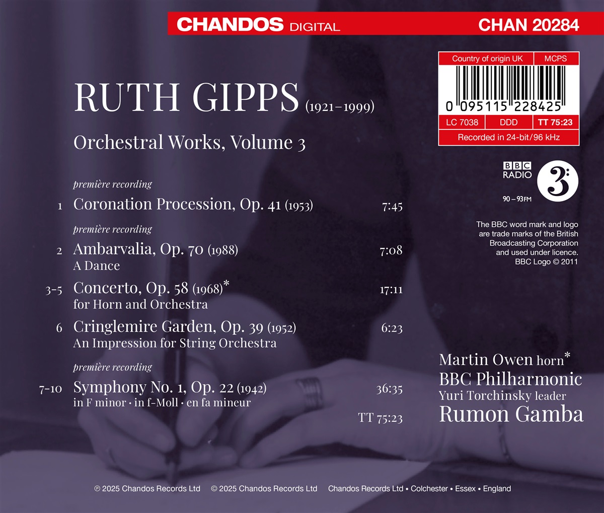Für diese dritte Folge seiner Reihe von Orchesterwerken von Ruth Gipps wird Rumon Gamba, der das BBC Philharmonic dirigiert, von dem Hornisten Martin Owen begleitet. Das Album beginnt mit Gipps' „Coronation Procession“. Das Stück beschreibt die Reise der Krone(n), vielleicht aus der Perspektive der königlichen Kutsche, die in der Westminster Abbey endet. Das im Januar 1953 geschriebene Stück wurde nicht bei der Krönung verwendet, sondern stattdessen erstmals im September 1954 in Melbourne, Australien, aufgeführt. „Ambarvalia“ ist eine Gedenkhommage von Gipps aus dem Jahr 1988 an den Komponisten und Kollegen Adrian Cruft, der im Februar 1987 verstorben war. Gipps schrieb das Hornkonzert 1968 für ihren Sohn Lance Baker. Das Stück wurde später von Frank Lloyd bekannter gemacht, der es 1982 in einer BBC-Sendung vorstellte. Hier erweckt der Virtuose Martin Owen das Werk auf mitreißende Weise zum Leben. Der Lake District war die Inspiration für die ‚Impression‘ „Cringlemire Garden“, eine pastorale Miniatur für Streichorchester. Die Erste Sinfonie vom September 1942 ist ein direktes Echo auf den Schrecken des Krieges. Das Werk zeigt Gipps' persönliche Handschrift und enthält einige wunderbare Passagen für Blasinstrumente.