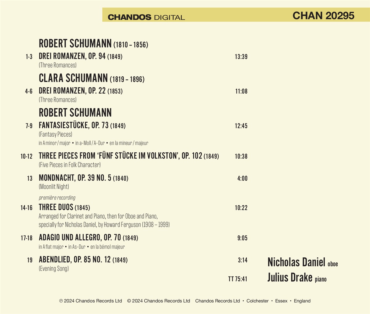 Das vorliegende Album enthält eine großzügige Auswahl an Kammermusik von Robert Schumann sowie die „Drei Romanzen“ op. 22 von Clara Schumann. Zu der Zeit, als diese Stücke geschrieben wurden, gab es ein schnell wachsendes Interesse an Noten für Hausmusik, das durch die aufstrebende bürgerliche Mittelschicht befeuert wurde. Schumann und Mendelssohn veröffentlichten zahlreiche Werke für diesen Markt. Es war üblich, dass die Stimmen durch jedes verfügbare Instrument ersetzt werden konnten. Obwohl Robert Schumanns „Drei Romanzen“ op. 94 die einzigen Werke sind, die ursprünglich für Oboe komponiert wurden, ist das Programm nicht nur musikalisch lohnend, sondern entspricht auch dem, was die Schumanns als normale Praxis angesehen hätten.