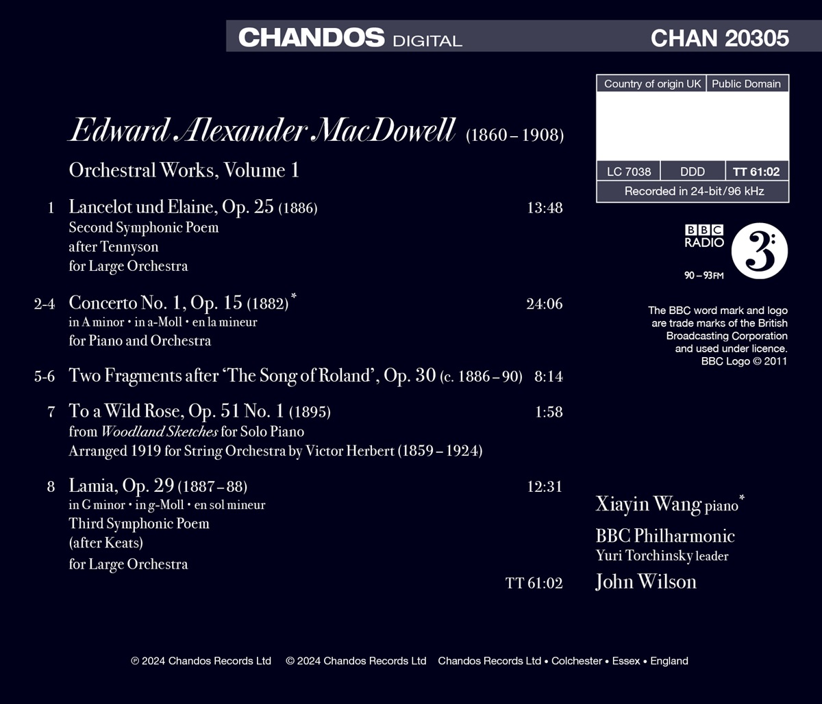 Edward MacDowell war der angesehenste amerikanische Komponist seiner Generation und der erste, der sich einen wahrhaft internationalen Ruf erwarb. Der in New York geborene MacDowell studierte als Teenager kurzzeitig Klavier am Pariser Konservatorium, verließ es jedoch schnell wieder, um das seiner Meinung nach musikalisch ansprechendere Umfeld in Deutschland zu erkunden. Er studierte Klavier und Komposition in Stuttgart, Wiesbaden und dann in Frankfurt. Nach seinem Abschluss im Jahr 1880 blieb er vier Jahre lang in Deutschland, bevor er zunächst für acht Jahre nach Boston und schließlich nach New York zurückkehrte, wo er der erste Professor für Musik an der Columbia University wurde. Zu den verschiedenen romantischen Einflüssen, die den Stil des Ersten Konzerts prägten, gehören die Musik von Liszt, Tschaikowski, Schumann und Grieg – die technischen Anforderungen an den Solisten offenbaren MacDowells Können als Pianist. MacDowells Begeisterung für die symphonische Dichtung spiegelt sich auf diesem Album in „Lancelot und Elaine“ und „Lamia“ wider. Ersteres wurde von der Artus-Legende inspiriert, wie sie Tennyson in seinen „Idylls of the King“ erzählt. Das Werk ist äußerst narrativ und verwendet wagnerische Leitmotive, um jede der Figuren darzustellen. „Lamia“, das etwa zwei Jahre später entstand und auf einem Gedicht von John Keats basiert, wurde zu Lebzeiten des Komponisten weder veröffentlicht noch aufgeführt. MacDowell hatte eine weitere symphonische Dichtung geplant, die auf der französischen mittelalterlichen Erzählung „La Chanson de Roland“ basieren sollte, doch das Werk wurde nie vollendet, und die beiden hier enthaltenen Fragmente sind alles, was davon übrig geblieben ist. „Woodland Sketches“, eine Sammlung von zehn Klavierminiaturen, wurden von der idyllischen Umgebung des MacDowells-Hofes in New Hampshire inspiriert. Das erste dieser Stücke – „To a Wild Rose“ – ist bei weitem das berühmteste Stück des Komponisten und machte MacDowell in Amerika und Europa zu einem Begriff. John Wilson dirigiert das BBC Philharmonic Orchestra und Xiayin Wang ist die Solopianistin.
