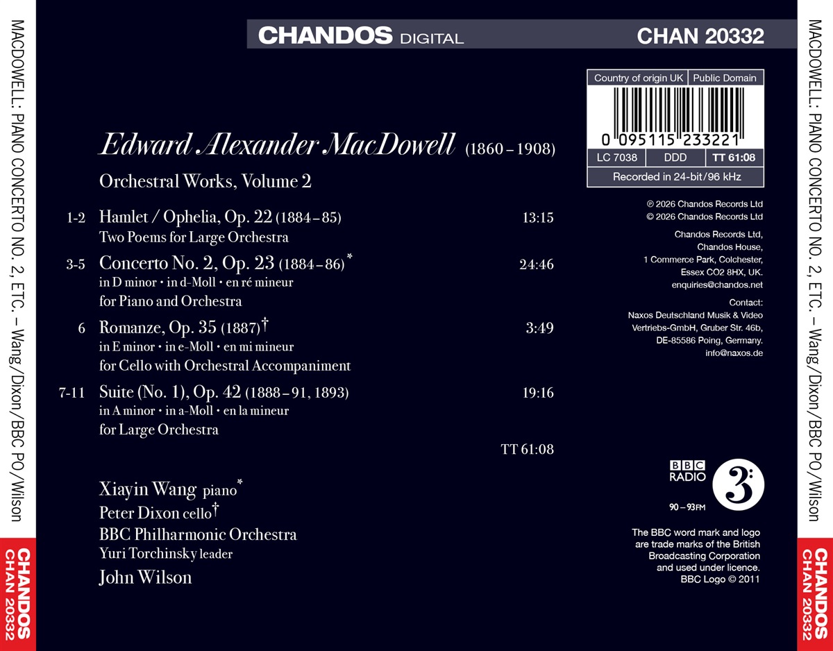 Im Juli 1884 verbrachten Edward MacDowell und seine Frau Marian ihre Flitterwochen in England und waren beide von den Aufführungen der Shakespeare-Stücke im Londoner Lyceum Theatre begeistert. Der junge Komponist begann sofort mit Skizzen zu sechs Figuren, vollendete jedoch nur zwei davon, Hamlet und Ophelia, die im folgenden Jahr veröffentlicht wurden. MacDowell verwendete einen Teil der Musik aus seiner Skizze für Benedikt aus „Viel Lärm um nichts“ als zweiten Satz seines zweiten Klavierkonzerts. Nachdem das Paar von 1885 bis 1888 in Deutschland gelebt hatte, kehrte es nach Amerika zurück, und MacDowell nahm seine Karriere als Konzertpianist wieder auf. Das zweite Konzert war das perfekte Mittel, um seine Virtuosität zu demonstrieren, und er gab 1889 die Uraufführung in New York. Die „Romanze für Cello und Orchester“, die im gleichen Zeitraum wie das zweite Konzert komponiert wurde, entstand 1887 in Wiesbaden, und MacDowell widmete sie dem virtuosen böhmischen Cellisten und Komponisten David Popper. Die „Suite in a-Moll” war das erste Werk, das MacDowell nach dem Umzug des Paares nach Boston komponierte, und spiegelt seine lebenslange Liebe zur Natur wider. Das fünfteilige Werk wurde 1895 vom Boston Symphony Orchestra unter der Leitung von Emil Paur uraufgeführt. Auf diesem Album sind die Pianistin Xiayin Wang, der Cellist Peter Dixon und das BBC Philharmonic Orchestra unter der Leitung von John Wilson zu hören.