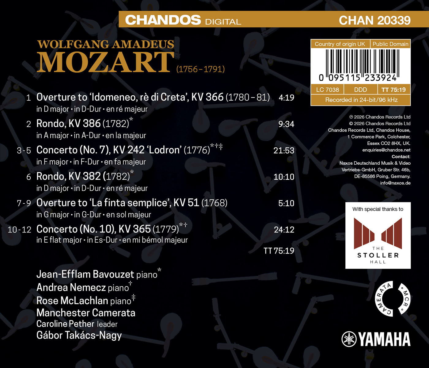 Jean-Efflam Bavouzets gefeierter Zyklus mit Klavierkonzerten von Wolfgang Amadeus Mozart findet mit diesem zwölften Teil seinen Abschluss. Das Programm ist durch eine feierliche Stimmung geprägt: Die Ouvertüren zu „Idomeneo“ und „La finta semplice“ umrahmen die Rondos für Klavier und Orchester in A-Dur und D-Dur sowie das Konzert für drei Klaviere und enden mit dem Doppelklavierkonzert. Bavouzet kommentiert: ‚Nach neun Jahren kommen wir nun mit den engagierten Mitgliedern der Manchester Camerata und meinem Freund Gábor Takács-Nagy zum Ende dieses kompletten Aufnahmeprojekts. Gábors Plan, die Klavierkonzerte mit Opernouvertüren zu kombinieren, war sicherlich sehr reizvoll, aber die Aufgabe, dieses enorme Konzertwerk in seiner Gesamtheit zu spielen, erschien mir gigantisch!‘ Doch die Gelegenheit, mit ihm und der Manchester Camerata zu musizieren und zudem seine Frau Andrea Nemecz – ‚eine echte Mozartianerin‘ an seiner Seite zu haben, war zu reizvoll, um die Gelegenheit ungenutzt verstreichen zu lassen. Jean-Efflam Bavouzets gilt derzeit als einer der besten Mozart-Interpreten und wurde mit zahlreichen Preisen ausgezeichnet, darunter der Diapason d'Or.