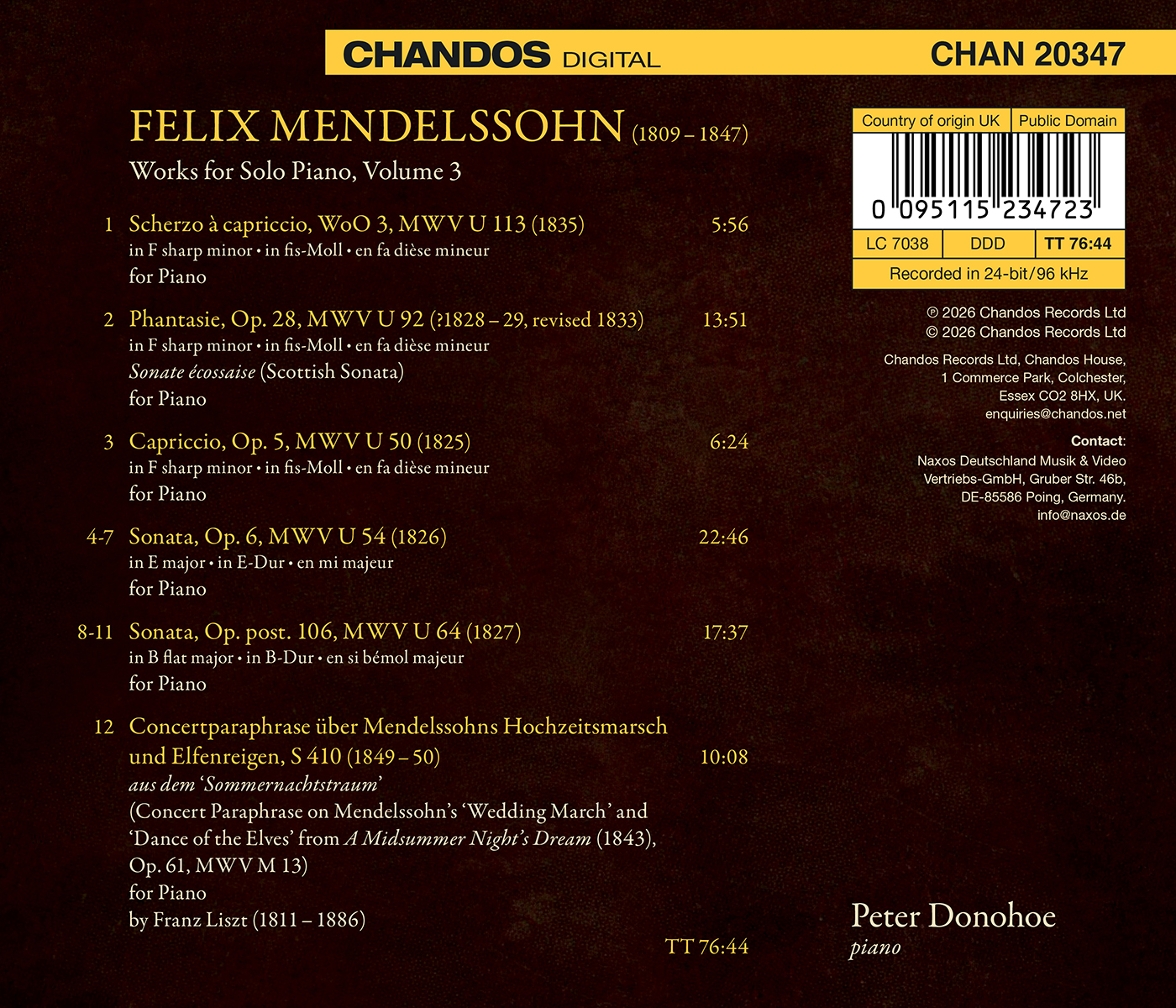 Alle hier aufgenommenen Werke wurden zwischen 1825 und 1835 komponiert, als Felix Mendelssohn zwischen sechzehn und sechsundzwanzig Jahre alt war. Einen Großteil dieses Jahrzehnts verbrachte er auf Reisen, von Berlin über Weimar nach Paris, dann nach London und Schottland, bevor seine Arbeit in Düsseldorf schließlich zu seiner Ernennung als städtischer Musikdirektor und Dirigent des Gewandhausorchesters in Leipzig führte. Die „Klaviersonate in E-Dur“ und die „Klaviersonate in B-Dur“ sowie die „Phantasie“ (mit dem Untertitel „Sonate écossaise“) gehen auf Beethoven zurück, sind aber auch von Carl Maria von Weber, Johann Nepomuk Hummel und Ignaz Moscheles (dem die Phantasie gewidmet ist) beeinflusst. Die beiden kürzeren Werke („Scherzo à capriccio“ und „Capriccio“) zeigen vielleicht eine entspanntere Seite des Komponisten, frei von den Zwängen der Sonatenform. Franz Liszts virtuose Umarbeitung von Themen aus „Ein Sommernachtstraum“ rundet das Programm ab. Der 1953 in Manchester geborene Peter Donohoe studierte sieben Jahre lang an der Chetham's School of Music, machte seinen Abschluss in Musik an der Universität von Leeds und studierte anschließend am Royal Northern College of Music bei Derek Wyndham sowie in Paris bei Olivier Messiaen und Yvonne Loriod. Er wird für seine Musikalität, stilistische Vielseitigkeit und souveräne Technik gelobt und ist so zu einem der führenden Pianisten unserer Zeit avanciert.