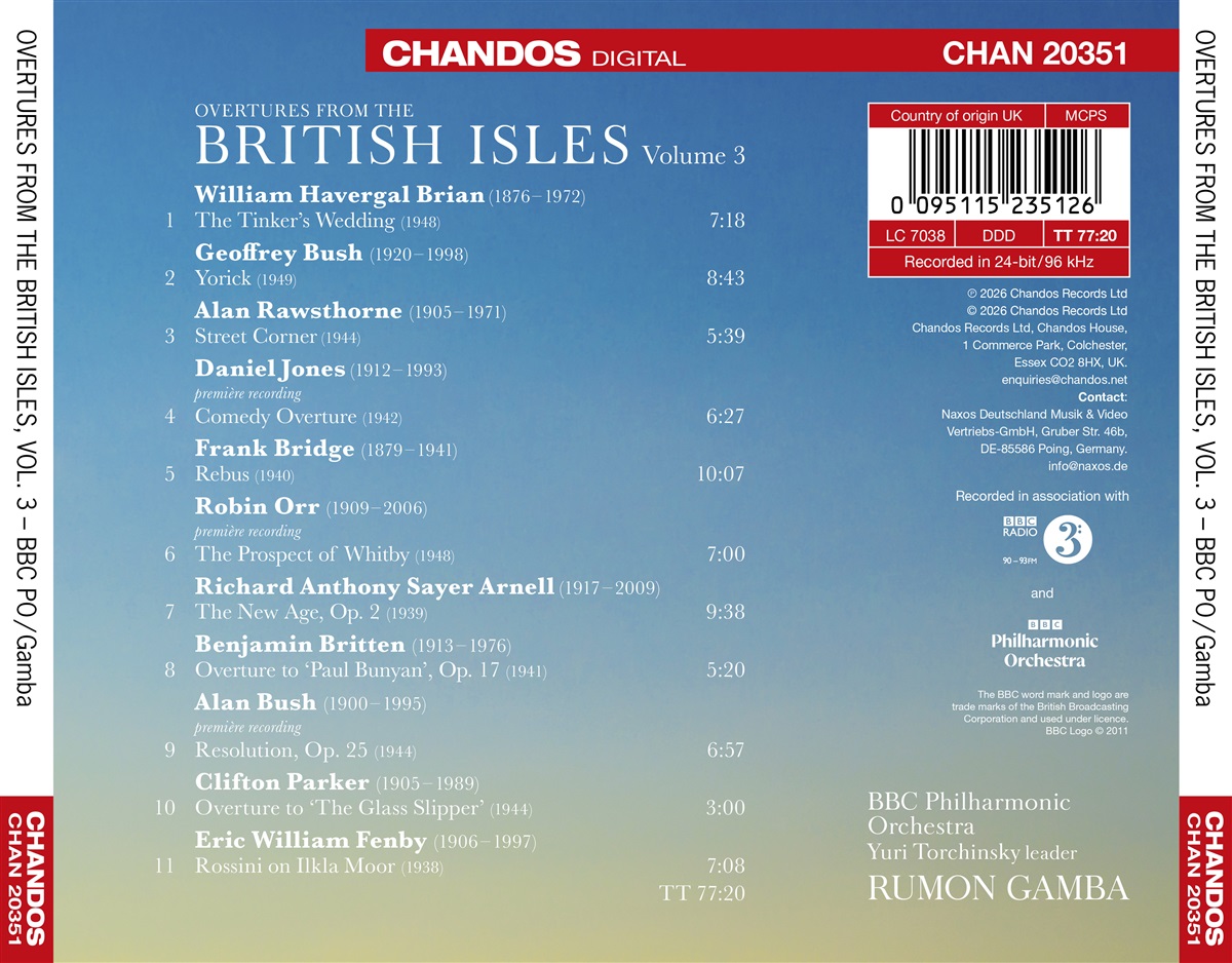 Rumon Gamba dirigiert das BBC Philharmonic Orchestra bem dritten Teil seiner „Overtures from the British Isles“. Wie schon bei den vorherigen Alben handelt es sich um selten gespieltes Repertoire, und das Album enthält drei Weltpremieren. Alle Werke entstanden in einem Zeitraum von elf Jahren zwischen 1938 und 1949 vor dem Hintergrund der schrecklichen Weltgeschehnisse dieser Zeit. Das Album präsentiert eine vielseitige Mischung musikalischer Stile und beleuchtet wie seine Vorgänger einige wunderbare Entdeckungen, die vom Orchester und Dirigenten leidenschaftlich und enthusiastisch interpretiert werden. Bei den Weltersteinspielungen handelt es sich um „Comedy Overture“ von Daniel Jones, „The Prospect of Whitby“ von Robin Orr und „Resolution“ von Alan Bush.