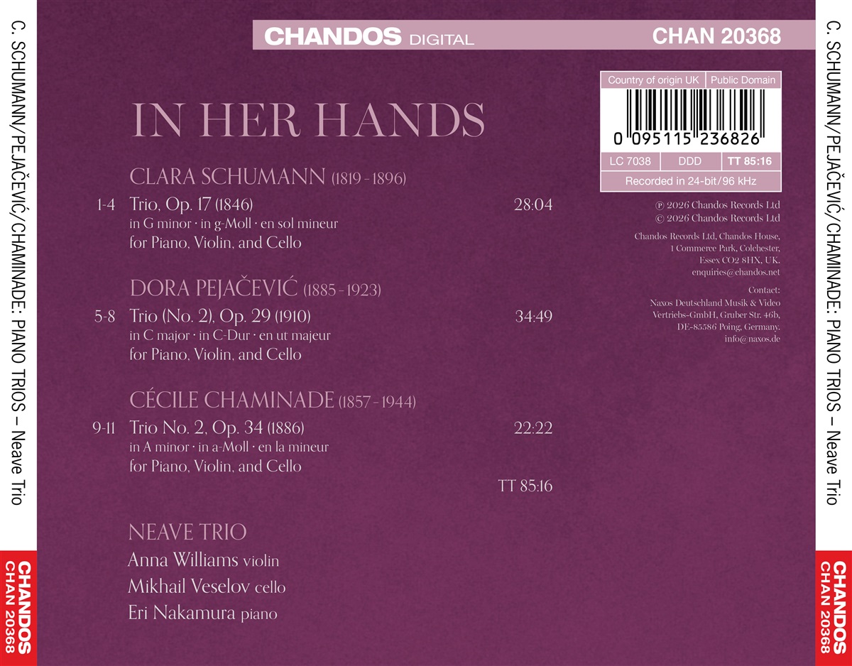 Das vom Magazin BBC Music für sein ‚großzügiges und warmherziges, absolut bezauberndes Spiel‘ gelobte und für den GRAMMY nominierte Neave Trio hat sich zu einem der besten jungen Ensembles seiner Generation entwickelt. Für ihr achtes Album haben sie erneut ein Programm mit Werken von Komponistinnen ausgewählt. Das 1846 komponierte Klaviertrio von Clara Schumann wurde von ihren Freunden und Unterstützern (insbesondere von Johannes Brahms) als großer Erfolg gewertet, doch ihr mangelndes Selbstvertrauen trübte ihre eigene Sicht auf das Stück. Dora Pejačević war von klein auf intellektuell neugierig und eine begeisterte Leserin und brachte sich das Komponieren weitgehend selbst bei. Ihr erstes Klaviertrio (in D-Dur) komponierte sie 1905 (im Alter von zwanzig Jahren), das zweite folgte 1910, als sich Pejačevićs musikalische Sprache bereits zu ihrem unverwechselbaren spätromantischen Stil entwickelt hatte. Cécile Chaminades Klaviertrio Nr. 2 in a-Moll wurde 1887 veröffentlicht und dem großen französischen Cellisten Jules Delsart gewidmet. Die erfolgreiche Uraufführung fand am 4. Februar 1886 in der Salle Érard statt. Chaminade spielte das Trio in a-Moll in den 1890er Jahren regelmäßig und erntete dafür große Anerkennung von der Kritik.