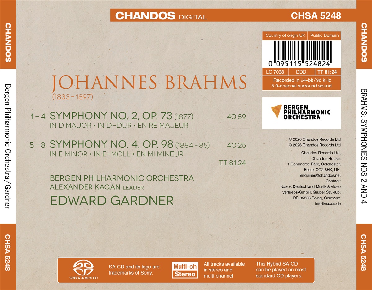 Johannes Brahms' erste Sinfonie ist dafür bekannt, dass sie von der Konzeption bis zur Uraufführung einundzwanzig Jahre brauchte – ein Zeichen sowohl für seine eigene, äußerst selbstkritische Einschätzung seines Schaffens als auch für die Erwartung seines Umfelds, dass seine Sinfonien nahtlos an Ludwig van Beethovens Werk anknüpfen würden. Erstaunlicherweise begann Brahms im Juni 1877 mit seiner zweiten Sinfonie, die nur sechs Monate später von den Wiener Philharmonikern unter Hans Richter uraufgeführt wurde. Ihr fröhlicher Charakter und ihre pastorale Stimmung stehen in starkem Kontrast zur ersten Sinfonie. Nach einer Pause von etwa sechs Jahren kehrte Brahms 1883 zu dieser Form zurück und komponierte kurz nacheinander seine dritte und vierte Sinfonie. Die 1884 begonnene vierte Sinfonie wurde im Oktober 1885 von Brahms und dem Meininger Hoforchester uraufgeführt. Das Werk ist besonders bemerkenswert wegen seines letzten Satzes in Form einer Passacaglia, eine Seltenheit, und als einzige von Brahms' Sinfonien in einer Molltonart endet.