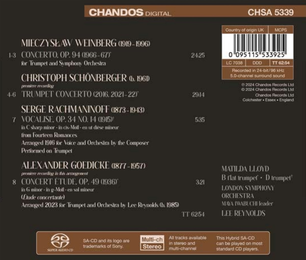 Matilda Lloyd schreibt: ‚Resonanz ist ein facettenreiches Wort mit vielen verschiedenen Bedeutungen, die alle in diesem Album mit Musik für Trompete und Orchester erforscht werden. Es stammt vom lateinischen Wort resonantia ab, das ‚Echo‘ bedeutet, und beide Konzerte auf diesem Album sind ein Echo der Musik der Vergangenheit. Weinbergs Trompetenkonzert enthält viele Fanfaren, die auf die militärischen Anfänge der Trompete zurückgehen, und in der ausgedehnten Kadenz zu Beginn des dritten Satzes fügt Weinberg Musikstücke anderer Komponisten ein, darunter Mahlers Fünfte Symphonie, Mendelssohns „Hochzeitsmarsch“ und Strawinskys „Pétrouchka“. Dabei handelt es sich jedoch nicht um oberflächliche Verweise auf die Vergangenheit, sondern eher um Euphemismen; Weinberg verdreht und verzerrt die Zitate zu etwas Dunklem und Bedrohlichem. Christoph Schönberger hat sein Konzert als „neo-romantisch“ bezeichnet und sich dabei auf die harmonische und melodische Sprache von Komponisten aus der Romantik bezogen. „Resonanz“ kann auch verwendet werden, um die kraftvollen Bilder, Gefühle oder Erinnerungen zu beschreiben, die beim Hören von Musik im Kopf entstehen. Rachmaninoffs Vocalise ist der ultimative Ausdruck dieser Art von Resonanz. Das letzte Werk auf der CD, Goedickes Concert Étude, hat eine persönliche Bedeutung für mich: Als ich aufwuchs, war es mein Lieblingswerk für Trompete und Klavier. Zu Beginn meiner Karriere war es meine bevorzugte Zugabe, und jetzt freue ich mich sehr über diese brandneue Orchesterfassung von Lee Reynolds.‘