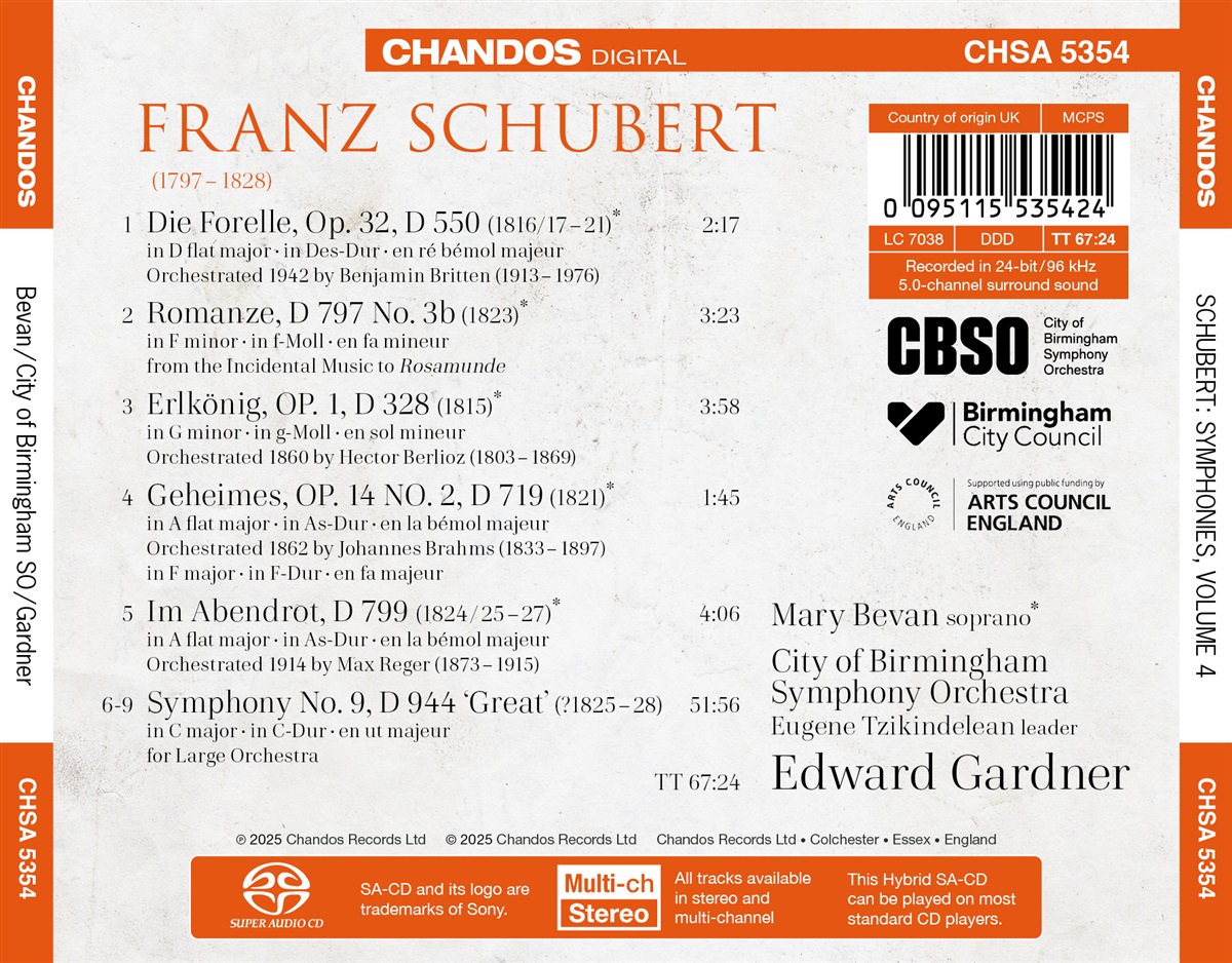 Edward Gardners Schubert-Zyklus endet mit der „Großen“ Sinfonie Nr. 9 in C-Dur. Nachdem er zwischen 1813 und 1818 (bemerkenswerterweise) jedes Jahr eine Sinfonie komponiert hatte, schienen der Ausbruch der Syphilis und die damit verbundene aufwendige Behandlung das Vertrauen des Komponisten in seine Fähigkeiten als Sinfoniker zu erschüttern – die Neunte ist die einzige Sinfonie nach den ersten sechs, die er tatsächlich vollendete. Dies wird von vielen auf einen wunderbaren Urlaub mit Freunden in den hohen österreichischen Alpen zurückgeführt, der seine Begeisterung neu entfacht zu haben scheint. Der Beiname „Große“ mag ursprünglich entstanden sein, um sie von der „kleinen“ C-Dur-Sinfonie (Nr. 6) zu unterscheiden, ist aber treffend, da die Neunte in einem so viel größeren Maßstab als jede Sinfonie zuvor angelegt ist und in manchen Aufführungen fast eine Stunde dauern kann. Die Sopranistin Mary Bevan begleitet Edward Gardner und das CBSO bei einer Auswahl von Orchesterliedern, die das Album vervollständigen. Eines davon wurde von Schubert selbst orchestriert, die anderen sind Vertonungen von Britten, Berlioz, Brahms und Reger.
