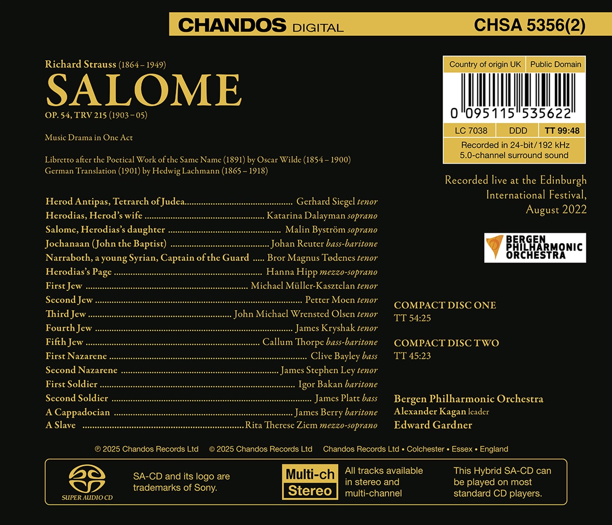 Oscar Wildes Stück „Salome“ wurde für die Schauspielerin Sarah Bernhardt konzipiert und sollte ursprünglich 1892 in London aufgeführt werden. Das Stück wurde jedoch von der Zensur verboten (damals war es nicht erlaubt, biblische Figuren auf der Bühne darzustellen), und so fand die Uraufführung 1896 in Paris statt. Wilde erlebte die einzigen beiden Aufführungen zu seinen Lebzeiten nicht, da er wegen homosexueller Handlungen eine Gefängnisstrafe verbüßte. Später wurde das Stück in Deutschland populär, und nachdem Richard Strauss 1902 eine Vorstellung in Berlin besucht hatte, beschloss er, dass dies das Thema für seine dritte Oper sein würde. Die 1905 uraufgeführte „Salome“ von Strauss ist inzwischen viel bekannter als Wildes Stück und wird regelmäßig in Opernhäusern auf der ganzen Welt gezeigt. Diese Live-Aufnahme wurde in der Usher Hall in Edinburgh im Rahmen des Edinburgh International Festival im August 2022 gemacht. Edward Gardner und das Bergen Philharmonic Orchestra werden von einer herausragenden Besetzung von Solisten begleitet, angeführt von Malin Byström in der Titelrolle, Gerhard Siegel als Herodes, Katarina Dalayman als Herodias und Johan Reuter als Johannes der Täufer. Die Aufnahme wurde in Surround Sound gemacht und ist als zwei Hybrid-SACDs und in Dolby Atmos Spatial Audio erhältlich.