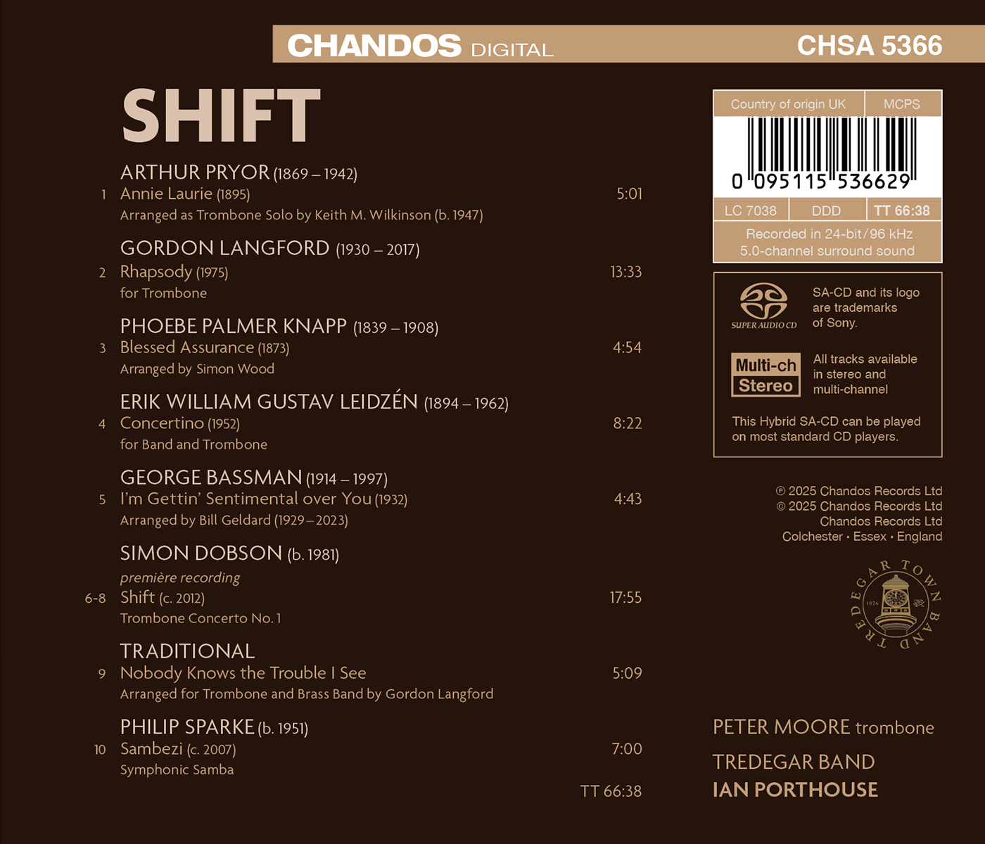 Der weltberühmte Posaunist Peter Moore wurde in Belfast geboren und wuchs im Großraum Manchester auf. Im Alter von zwölf Jahren erlangte er internationale Aufmerksamkeit, als er 2008 der jüngste Gewinner des Wettbewerbs BBC Young Musician wurde. Seine frühe Einbindung in die Blasmusikkultur in Nordengland war entscheidend für seine rasche Entwicklung. Mit erst 18 Jahren wurde er zum stellvertretenden Soloposaunisten des London Symphony Orchestra ernannt, verließ dieses jedoch nach zehn Jahren, um sich auf seine Solokarriere zu konzentrieren. Er hat Konzerte mit führenden Orchestern wie dem BBC Symphony Orchestra, dem London Symphony Orchestra und dem Royal Philharmonic Orchestra gegeben und Rezitale an Veranstaltungsorten wie dem Koninklijk Concertgebouw in Amsterdam, der Wigmore Hall in London und dem Wiener Musikverein aufgeführt. Dieses Album feiert Peter Moores lebenslange Verbundenheit mit der Brass-Band-Bewegung mit einem vielfältigen Programm, das bedeutende Werke wie Gordon Langfords „Rhapsody“ (geschrieben für Don Lusher) und die Weltersteinspielung von Simon Dobsons „Shift“ – ein für ihn geschriebenes Posaunenkonzert – umfasst. Moore zollt auch anderen großen Posaunisten Tribut: Arthur Prior war Solist in der Souza-Band, während „I'm Gettin' Sentimental Over You“ ein großer Hit für Tommy Dorsey war.