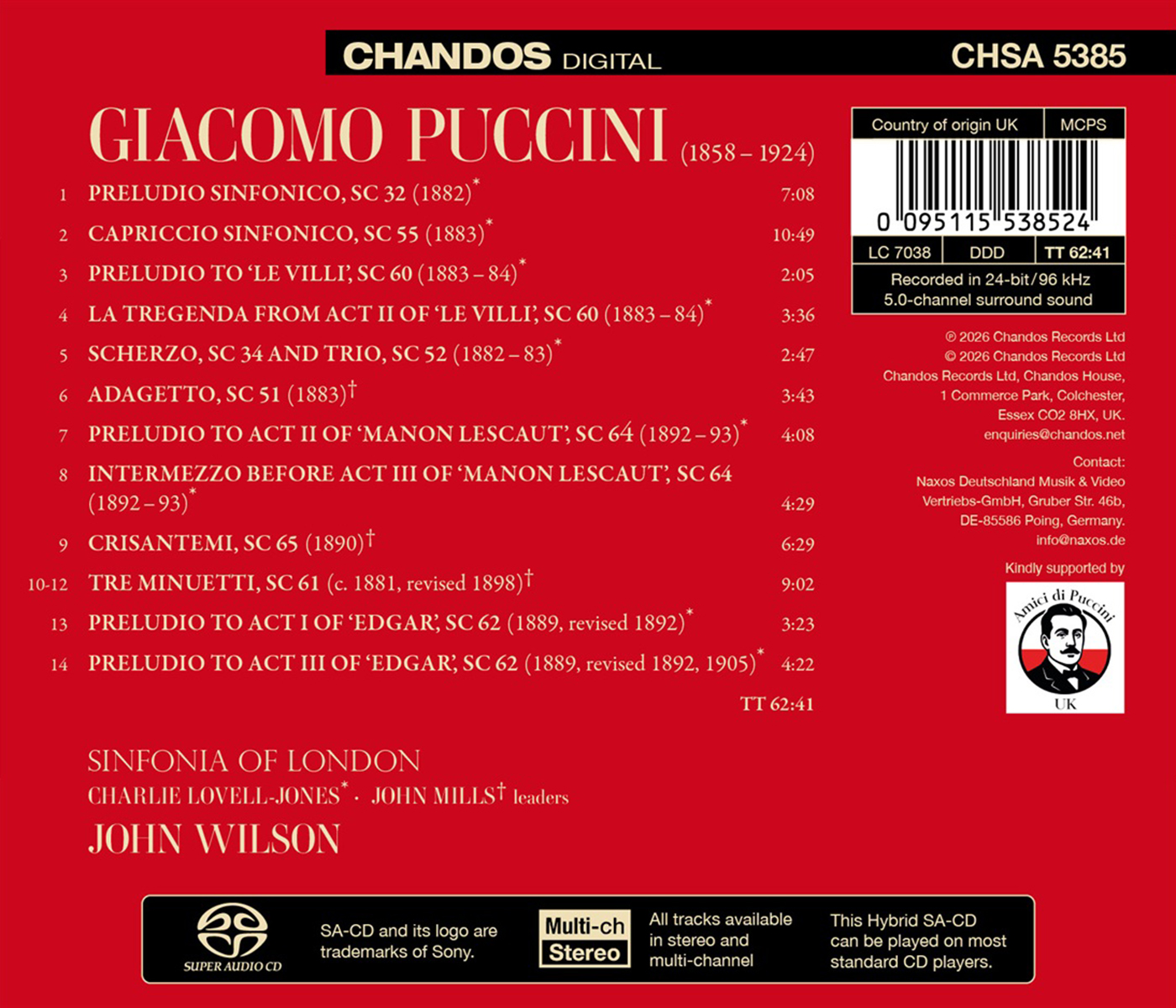 Giacomo Puccini gilt als einer der größten Opernkomponisten aller Zeiten, und seine frühen Werke – bevor ihn „Manon Lescaut” zu internationalem Ruhm katapultierte – bieten einen faszinierenden Einblick in seine Entwicklung als Komponist. John Wilson und die Sinfonia of London erkunden dieses Repertoire mit ihrem charakteristischen Stil und Engagement und nehmen uns mit auf eine Reise durch studentische Kompositionen und Orchesterauszüge aus seinen frühesten Opern. Von 1880 bis 1883 studierte er bei Amilcare Ponchielli am Mailänder Konservatorium und schuf das „Preludio sinfonico“ (frei nach Richard Wagners Vorspiel zu „Lohengrin”), das Scherzo, Trio und Adagetto sowie das „Capriccio sinfonico“, sein Abschlussstück, das bekanntlich die Eröffnung von „La bohème” um ein Jahrzehnt vorwegnimmt. Die Einakter-Oper „Le villi” wurde für einen Wettbewerb des Verlegers Sonzogno komponiert (Puccini gewann nicht), während Themen aus den gleichzeitig erarbeiteten „Tre minuetti” und „Crisantemi” (beide für Streichquartett) später in „Manon Lescaut” wiederverwendet wurden. Giuseppe Verdis Verleger Ricordi kaufte die Rechte an „Le villi“ und gab gleichzeitig ein neues Werk in Auftrag: „Edgar“, das vor allem aufgrund seiner absurden Handlung wohl Puccinis einziger Misserfolg ist, obwohl es einige ausgereifte Musikstücke enthält, die den berühmteren Partituren in nichts nachstehen.