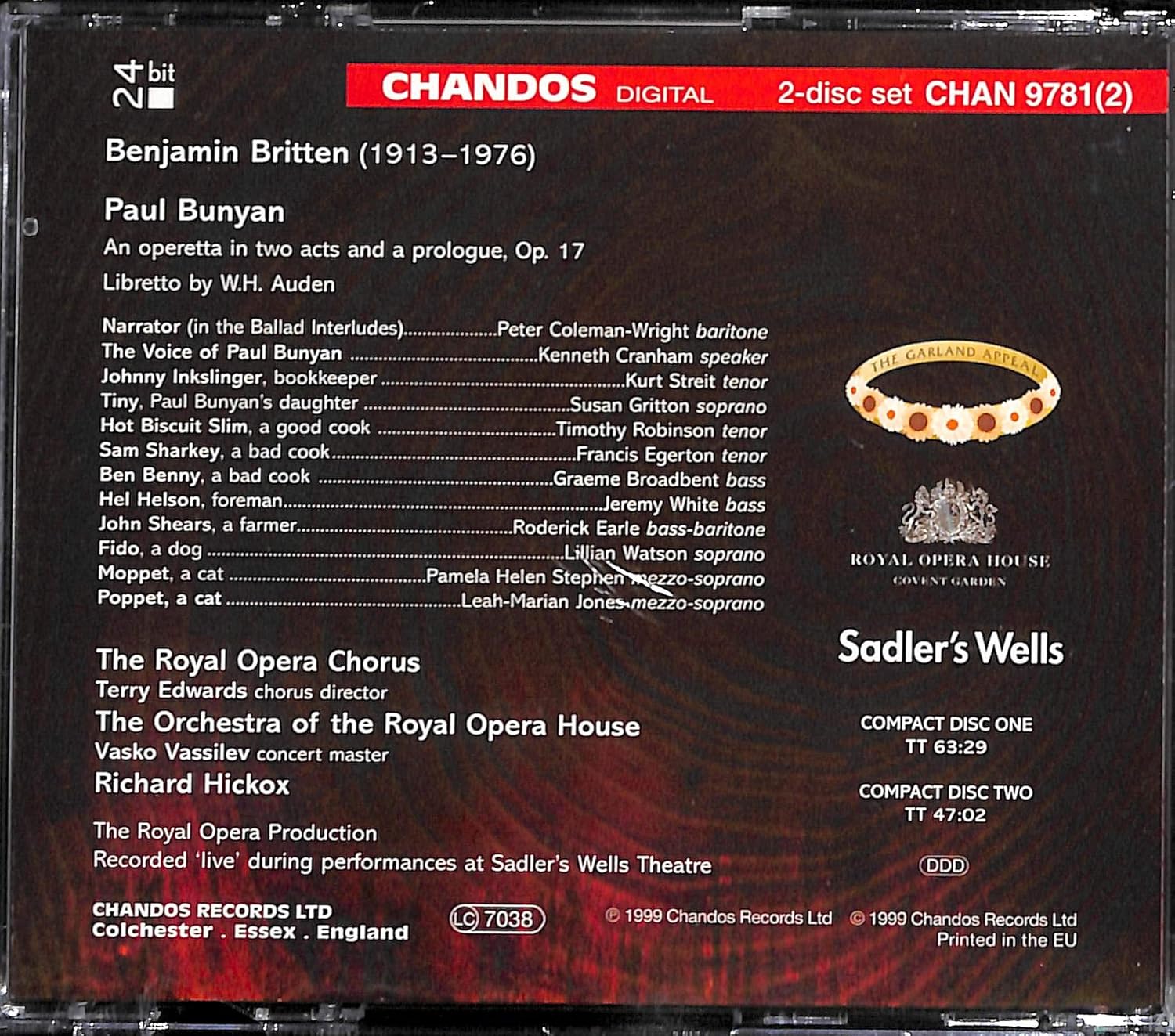 Bell, Donaldson / Broadbent, Graeme / Coad, Jonathan / Coleman-Wright, Peter / Cranham, Kenneth / Earle, Roderick / Egerton, Francis / Fisher, Jonathan / Gillespie, Neil / Griffiths, Neil / Gritton, Susan / Hazell, Richard / Hickox, Richard / Jones, Leah Marian / Keyte, Christopher / Lackner, Christopher / Moss, Henry / Parfitt, Wyndham / Robinson, Timothy / Royal Opera House Chorus, Covent Garden / Royal Opera House Orchestra, Covent Garden / Secombe, Bryan / Stephen, Pamela Helen / Streit, Kurt / Watson, Lillian / White, Jeremy / Winfield, John