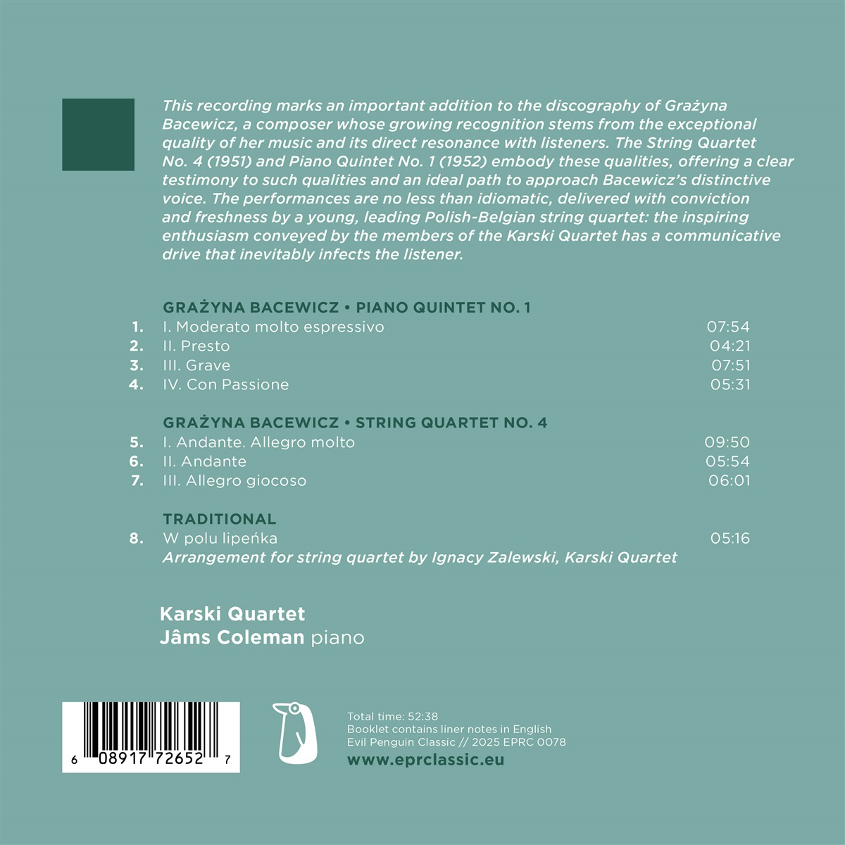 Diese Aufnahme ist eine wichtige Ergänzung zur Diskografie von Grażyna Bacewicz, einer Komponistin, deren wachsende Anerkennung auf der außergewöhnlichen Qualität ihrer Musik beruht. Bacewicz trat bereits als Kind auf und begann im Alter von 13 Jahren, Musik zu komponieren. Nach einigen Jahren als Konzertmeisterin im Orchester des Polnischen Rundfunks und als Künstlerin bei eigenen Tourneen konzentrierte sie sich später auf das Komponieren und unterrichtete am Warschauer Konservatorium. Außerdem war sie Schriftstellerin. Das Streichquartett Nr. 4 (1951) und das Klavierquintett Nr. 1 (1952) verkörpern ihre Qualitäten und bieten einen idealen Zugang zu Bacewicz' unverwechselbarer Stimme. Die Darbietungen sind nicht weniger als idiomatisch und werden von einem jungen, aber bereits namhaften polnisch-belgischen Streichquartett mit Überzeugung und Frische vorgetragen: Die inspirierende Begeisterung der Mitglieder des Karski Quartetts hat eine kommunikative Kraft, die den Zuhörer unweigerlich mitreißt.