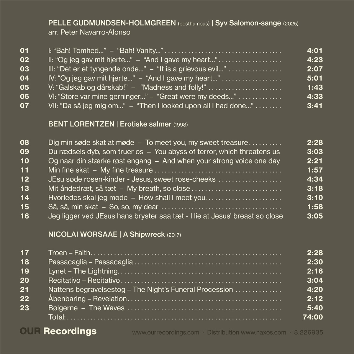 Der gefeierte dänische Bassbariton Jakob Bloch Jespersen, der hier auch alle Perkussionsinstrumente spielt, und der dänisch-spanische Organist und Komponist Peter Navarro-Alonso haben zehn Jahre an diesem Album gearbeitte, das ein Tribut an den Organisten Jens E. Christensen darstellt. Drei kontrastreiche Liederzyklen herausragender dänischer Komponisten erkunden diese einzigartige Klangwelt. Der verstorbene Pelle Gudmundsen-Holmgreen ist mit seinem musikalischen Vermächtnis vertreten, einer Reihe von Transkriptionen aus seiner Oper „Sun Rises, Sun Sets“, die auf dem biblischen Hohelied Salomos basiert. Der ebenfalls verstorbene Bent Lorentzen, eine der Schlüsselfiguren und Pioniere der frühen dänischen elektronischen Musik, beschäftigte sich in seinem Liederzyklus „Erotic Hymns“ mit Themen der sinnlichen und göttlichen Liebe, wobei er manchmal an einen nordischen Messiaen erinnert. Das Konzert endet mit Nicolai Worsaaes emotional und klanglich überwältigendem Theaterstück für Bassstimme und Orgel, „A Shipwreck“. Dieses Werk beschäftigt sich mit den Themen Leben, Tod und Auferstehung und reizt die Ausdrucksmöglichkeiten der prächtigen Orgel der Vor Frelsers Kirke (Kirche Unseres Erlösers) in Kopenhagen bis zum Äußersten aus. Die Aufführung wurde von einem der renommiertesten Toningenieure Dänemarks, Preben Iwan, mit beeindruckender Unmittelbarkeit eingefangen. Der Bassbariton Jakob Bloch Jespersen ist ein gefragter Konzert- und Opernsänger in ganz Europa und sein Repertoire umfasst Barock bis zeitgenössische Musik, mit einem besonderen Schwerpunkt auf Dieterich Buxtehude und Johann Sebastian Bach. Organist und Komponist Peter Navarro-Alonso hat über 400 Konzerte in Europa und den USA gegeben, wobei er sich auf zeitgenössische Musik konzentrierte und rund 100 Auftragswerke uraufführte. Seit 2021 ist er Organist an der Our Saviour's Church in Kopenhagen.