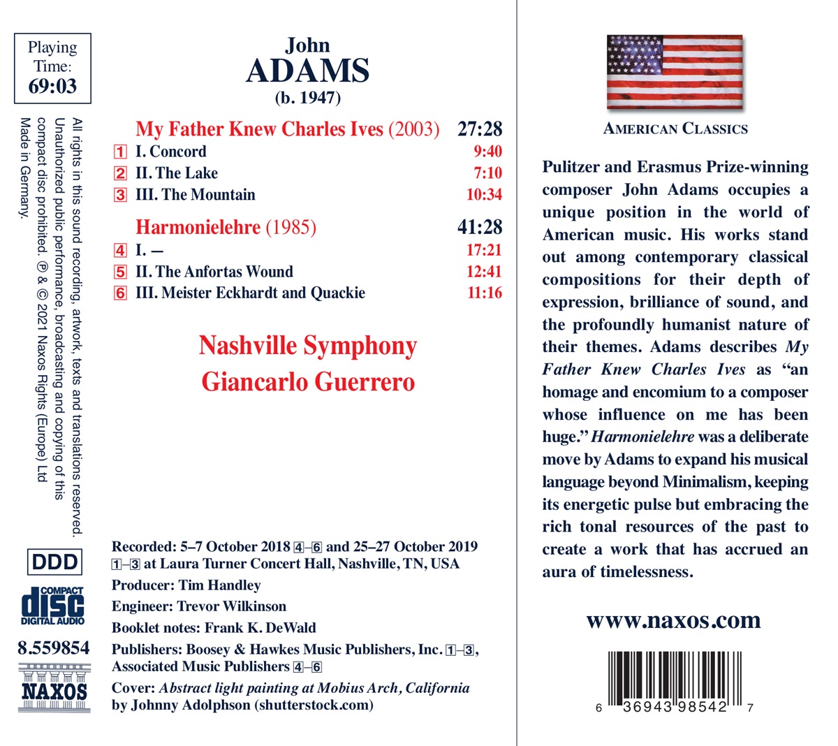 Adams beschreibt „My Father Knew Charles Ives“ als »eine Hommage und ein Loblied auf einen Komponisten, dessen Einfluss auf mich enorm war.« „Harmonielehre“ war 1985 ein bewusster Schritt, seine musikalische Sprache über den Minimalismus hinaus zu erweitern: Er erhielt den energiegeladenen Impuls-Charakter der Minimal Music, bereicherte aber seine Tonsprache mit den klanglichen Mitteln der Vergangenheit, um so eine zeitlose Form von Musik zu erschaffen.