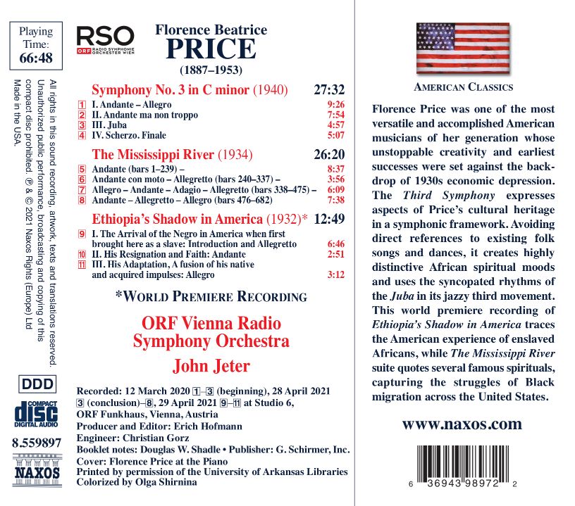 Florence Price war eine der vielseitigsten amerikanischen Musikerinnen ihrer Generation, deren ungebremste Kreativität und früheste Erfolge vor dem Hintergrund der wirtschaftlichen Depression der 1930er Jahre stattfanden. Die dritte Sinfonie stellt Facetten von Prices afroamerikanischer kultureller Identität in den Mittelpunkt. Hierzu schuf sie höchst charakteristische Spritual-Harmonien (ohne diese direkt zu zitieren) und verwendete synkopische Rhythmen im jazzigen dritten Satz. Die Weltersteinspielung von „Ethiopia's Shadow in America“ zeichnet in drei Sätzen die Geschichte versklavter Afrikaner in Amerika nach; die Suite „The Mississippi River“ zitiert direkt mehrere berühmte Spirituals und setzt sie in einen politischen Kontext.