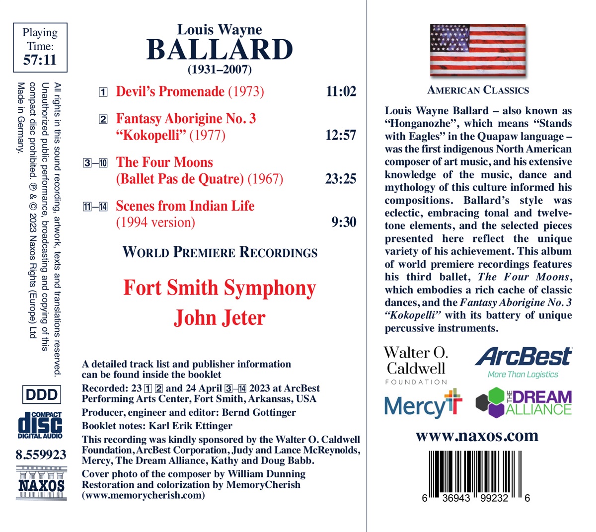 Louis Wayne Ballard war der erste indigene nordamerikanische Komponist klassischer Musik. Sein umfangreiches Wissen über die Musik, den Tanz und die Mythologie der First Nations flossen in seine Kompositionen ein, wobei bei Ballards Stil selbst eklektisch war und tonale sowie zwölftönige Elemente umfasste. Die auf dem Album ausgewählten Stücke spiegeln den Facettenreichtum seines Schaffens wider. Es enthält die Musik zu seinem dritten Ballett „The Four Moons“, das zahlreiche indigene Tänze vorstellt. Außerdem sind die „Devil’s Promenade“, die kurze Orchestersuite „Scenes from Indian Life“ und die dritte Fantasy Aborigine „Kokopelli“ mit ihren zahlreichen Perkussionsinstrumenten zu hören.