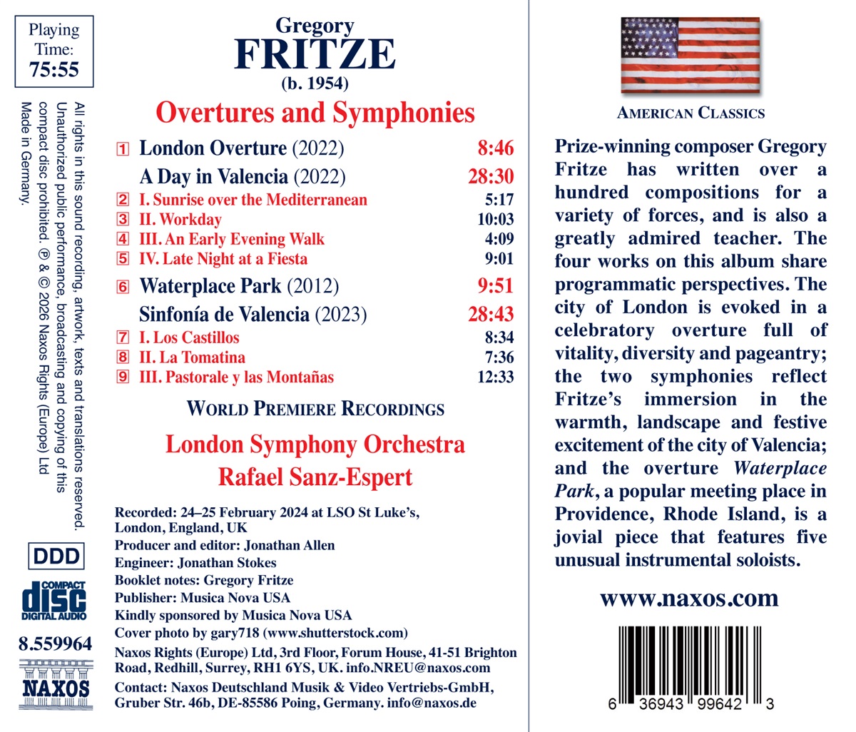 Der preisgekrönte Komponist Gregory Fritze hat über hundert Kompositionen für verschiedene Besetzungen geschrieben und ist außerdem ein hochgeschätzter Lehrer. Die vier Werke auf diesem Album sind sich programmatisch ähnlich. Die Stadt London wird in einer feierlichen Ouvertüre voller Vitalität, Vielfalt und Prunk heraufbeschworen; die beiden Sinfonien spiegeln Fritzes Eintauchen in die Wärme, Landschaft und festliche Ausgelassenheit der Stadt Valencia wider; und die Ouvertüre „Waterplace Park“, ein beliebter Treffpunkt in Providence (Rhode Island, USA) ist ein fröhliches Stück, in dem fünf ungewöhnliche Instrumentalsolisten zu hören sind. Gregory Fritze ist ein preisgekrönter Komponist und Fulbright-Stipendiat, dessen Werke mehr als tausend Mal in 26 Ländern aufgeführt wurden. Er hat über 60 Auszeichnungen für seine Kompositionen erhalten und war 14 Jahre lang Chefdirigent des Boston Brass Ensemble. Neben seinen kompositorischen Erfolgen ist er mehr als tausend Mal als Musiker und Dirigent in Blechbläserensembles aufgetreten. Der Dirigent Rafael Sanz-Espert war Chefdirigent in Bilbao, Madrid und Valencia und zudem Gastdirigent auf vier Kontinenten.