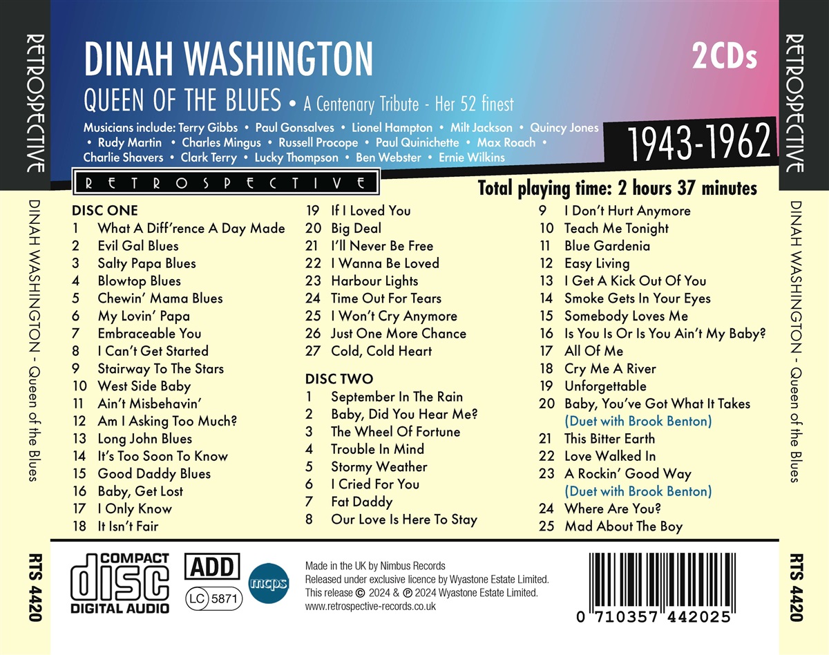 Die Königin des Blues war die in Alabama geborene Ruth Lee Jones (1924-1963), die als Dinah Washington die „einflussreichste Sängerin der letzten 40 Jahre“ (Jazz, The Rough Guide) wurde. Mit ihrem ganz eigenen Stil war sie im R&B-Bereich sehr erfolgreich und lieferte, meist mit einer entspannten Jazz-Begleitung, auch unzählige denkwürdige Interpretationen populärer Standards. „Queen Of The Blues“ ist auch der Titel des Retrospective-Programms zum hundertjährigen Geburtstag, das nicht weniger als 52 ihrer besten Aufnahmen enthält, die ihre gesamte fabelhafte Karriere umspannen (die nur durch ihren frühen Tod im Alter von 39 Jahren beendet wurde). Dinah war eine geborene Jazzsängerin und viele der großen Jazztalente dieser Ära brillierten mit ihr in Sessions, teilweise unter der Leitung von Quincy Jones: Clark Terry, Ben Webster, Lucky Thompson, Paul Quinichette, Paul Gonsalves.