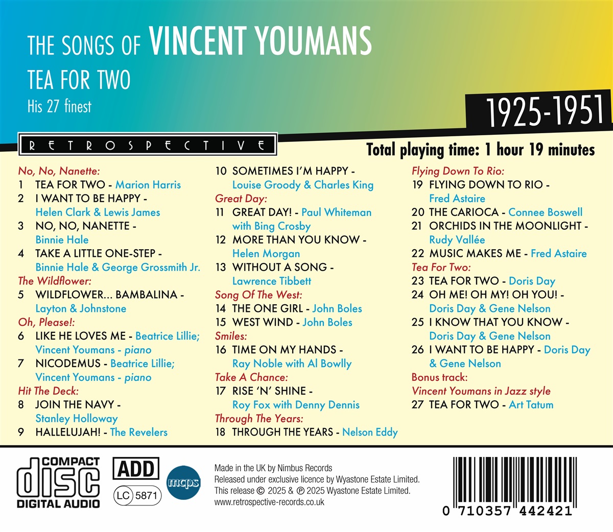 Die 16. Veröffentlichung in der phänomenalen „The Songs Of . . .“-Reihe von Retrospective, die den größten Songwritern aller Zeiten gewidmet ist, würdigt den Mann, der „Tea For Two“ geschrieben hat. Vincent Youmans schuf zahlreiche Songs, die zu beliebten Evergreens wurden, darunter „I Want To Be Happy“, „Hallelujah“, „The Carioca“, „Sometimes I'm Happy“, „More Than You Know“, „Time On My Hands“, „Without A Song“ und „Great Day“. Wie bei jedem Album dieser Reihe wurde eine wunderbare Auswahl an Künstlerinnen und Künstlern zusammengestellt, von denen viele die Stücke zum ersten Mal aufführten oder besonders mit den Liedern in Verbindung gebracht wurden: Fred Astaire, Connee Boswell, Al Bowlly, Nelson Eddy, Doris Day (vier Lieder aus ihrem Youmans-Film „Tea For Two“) und viele mehr. Und als Bonus gibt es Art Tatums erstaunliches „Tea For Two“ mit seiner Jazz-Magie.