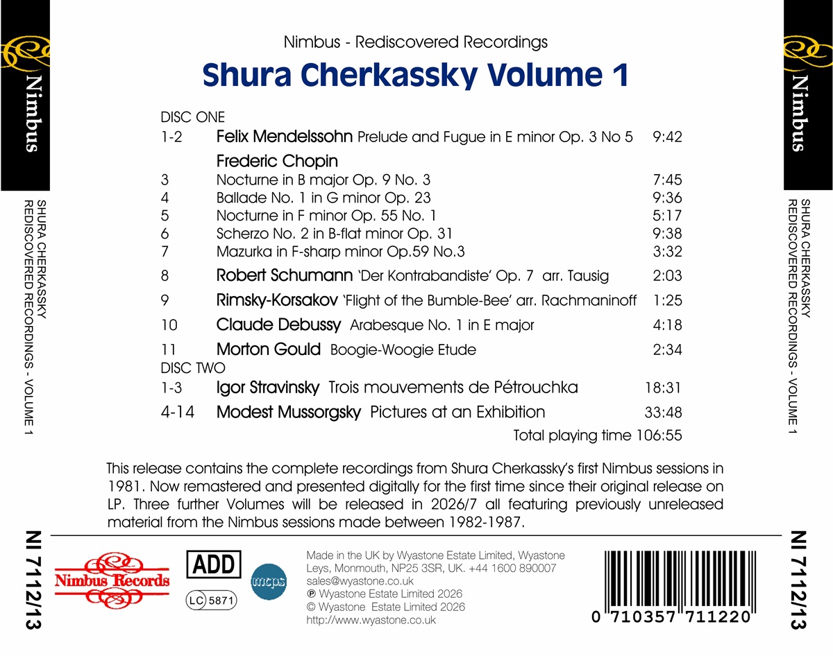 Anfang der 1980er Jahre galt der Pianist Shura Cherkassky als einer der „Großen” seiner Generation, deren unbestrittener König Vladimir Horowitz war. Doch nach einer langen, bemerkenswerten Karriere, die bereits in seiner Jugend begann, war seine Popularität in Konzertsälen und Aufnahmestudios rückläuftig. Er wurde dem jungen Label Nimbus vorgestellt, und sein erster Besuch dauerte vier Tage – vom 31. Januar bis zum 3. Februar 1981. Er wohnte im legendären Studio Wyastone Leys, einem imposanten Gebäude. Der große viktorianische Empfangsraum diente als spektakulärer Aufführungsort, dessen raumhohe Fenster einen beeindruckenden Blick auf das Wye-Tal boten. Shura war begeistert und signierte eine Kopie seiner LP „Bilder einer Ausstellung“ mit den Worten ‚An alle bei Nimbus, mit Liebe und dem wunderbarsten Gefühl der Inspiration‘. Die während dieser vier Tage entstandenen Aufnahmen sind alle auf dieser Veröffentlichung zu hören. Die vorgestellten Werke stammen von Felix Mendelssohn, Frédéric Chopin, Robert Schumann, Nikolai Rimski-Korsakow, Claude Debussy, Morton Gould, Igor Strawinsky und Modest Mussorgski.