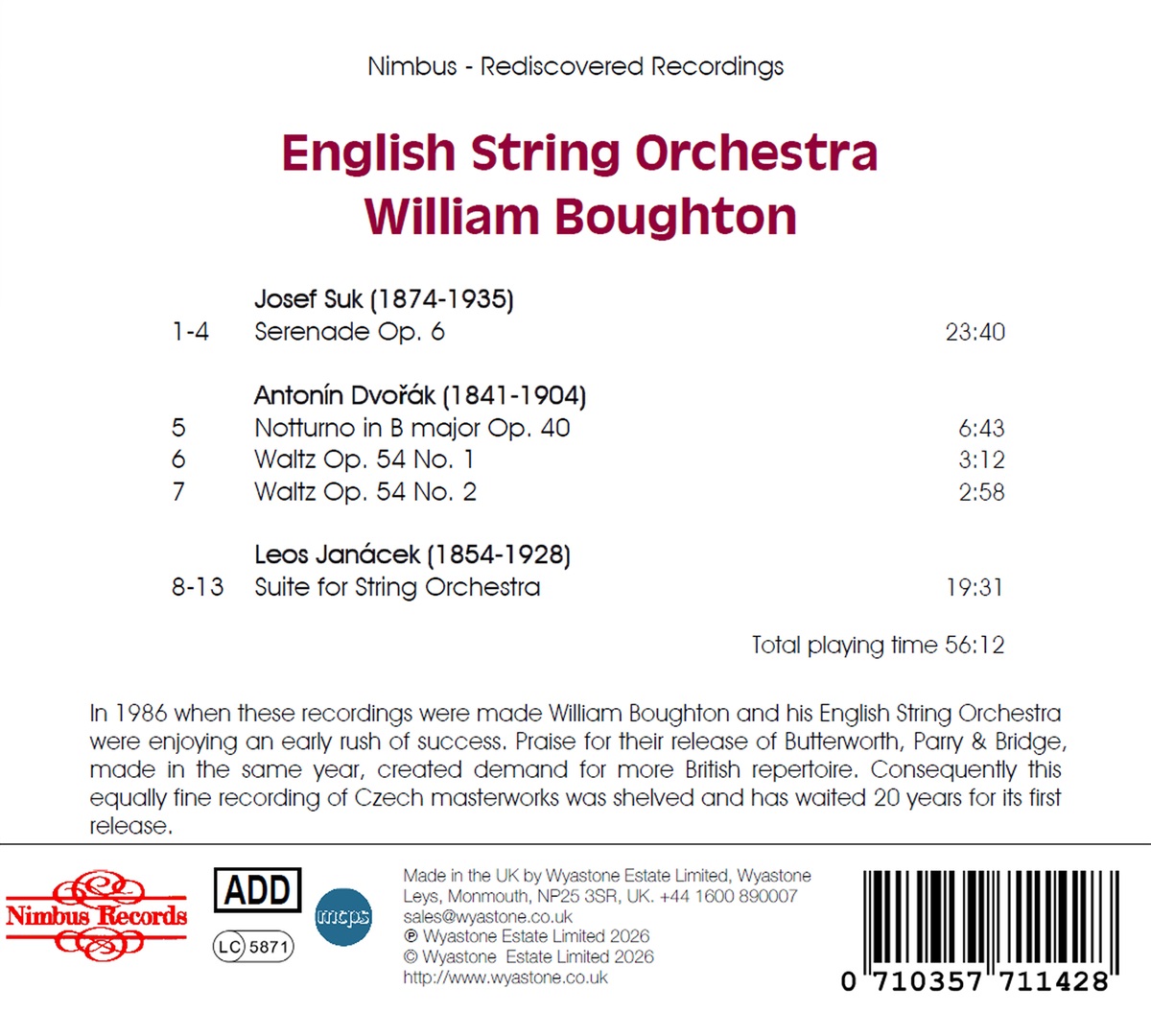 Anschließend nahm man zwei überaus erfolgreiche Alben mit englischem Repertoire (Elgar einerseits sowie Butterworth und Parry andererseits) auf. Vor allem bei den US-amerikanischen Radiosendern erfreuten sich die englischen Aufnahmen des English String Orchestra großer Beliebtheit. Daher erschien es vielleicht nicht opportun, diese zwischenzeitlich produzierten Aufnahmen mit Werken der tschechischen Meister Josef Suk, Antonín Dvořák und Leos Janáček zu veröffentlichen. Sie gerieten in Vergessenheit und wurden erst kürzlich in den Archiven wiederentdeckt. Nun erfahren sie, mit über 40-jähriger Verspätung, ihre Erstveröffentlichung.