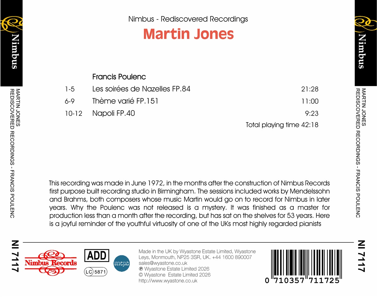 Diese Aufnahme entstand im Juni 1972, wenige Monate nach der Fertigstellung des ersten eigens für diesen Zweck gebauten Aufnahmestudios von Nimbus Records in Birmingham. Die Sessions umfassten Werke von Felix Mendelssohn und Johannes Brahms, zwei Komponisten, deren Musik Martin in späteren Jahren für Nimbus aufnehmen sollte. Warum das Werk von Francis Poulenc nicht veröffentlicht wurde, ist ein Rätsel. Es wurde weniger als einen Monat nach der Aufnahme als Master für die Produktion fertiggestellt, lag aber 53 Jahre lang ungenutzt in den Regalen. Martin Jones Martin Jones ist seit seinem internationalen Durchbruch im Jahr 1968, als er den Dame-Myra-Hess-Award erhielt, einer der angesehensten Solopianisten Großbritanniens. Im selben Jahr gab er sein Debüt in London in der Queen Elizabeth Hall und in New York in der Carnegie Hall und ist seitdem auf beiden Seiten des Atlantiks für Recitals und Konzertauftritte gefragt. Er ist ein produktiver Aufnahmekünstler und zu seinen zahlreichen großen Projekten gehören die gesamten Soloklavierwerke von Felix Mendelssohn, Johannes Brahms, Claude Debussy, Percy Grainger, Igor Strawinsky, Erich Wolfgang Korngold, Karol Szymanowski, Enrique Granados, Carlos Guastavino, Federico Mompou, Ernesto Halffter Escriche, Joaquin Nin, Has Gál, Jean Françaix, Jean Roger-Ducasse und Alan Richardson.