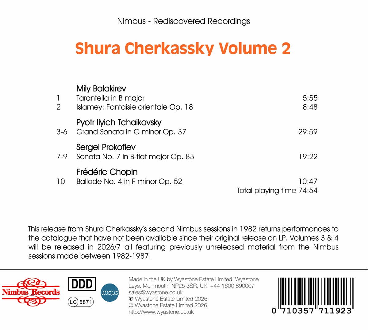 Nimbus Records entdeckte während der Lockdowns der Corona-Pandemie Juwele, die lange in den Regalen des Archivs schlummerten. Mehr als 50 Aufnahmeprojekte werden nun nach und nach veröffentlicht. Einige dieser Aufnahmen reichen bis zur Gründung von Nimbus in den späten 1960er Jahren zurück. Pianist Shura Cherkassky wurde Nimbus von Wilfred Stiff vorgestellt, der damals Direktor der Londoner Agentur Ibbs & Tillett war. Cherkassky galt damals als einer der ‚Großen’ der Generation, deren unbestrittener König Vladimir Horowitz war, aber nach einer langen, bemerkenswerten Karriere, die in der Mitte seiner Teenagerjahre begann, war seine Popularität im Konzertsaal und im Aufnahmestudio gesunken. Seine späte Karriere brauchte einen letzten Schub. Cherkassys erster Besuch dauerte vier Tage - vom 31. Januar bis 3. Februar 1981. Die Ergebnisse dieser Session wurden auf LP, aber nie auf CD veröffentlicht. Sie sind in Teil 1 dieser Reihe wieder erhältlich. Für diese zweite Session mit Stücken von Mily Balakirev, Piotr Tschaikowski, Sergei Prokofiev und Frédéric Chopin war das Studio wie zuvor eingerichtet, mit einemHamburger Steinway von 1969. Es war ein Studio, das so ganz anders war als die charakterlosen Räume, die Cherkassy nie gemocht hatte. Der große viktorianische Empfangssaal in Wyastone Leys war ein spektakulärer Aufführungsraum, seine raumhohen Fenster boten einen herrlichen Blick auf das Wye Valley. Shura war begeistert und signierte ein Exemplar seiner „Pictures at an Exhibition“-LP mit den Worten ‚To everyone in Nimbus with love and the most wonderful feeling of inspiration’.