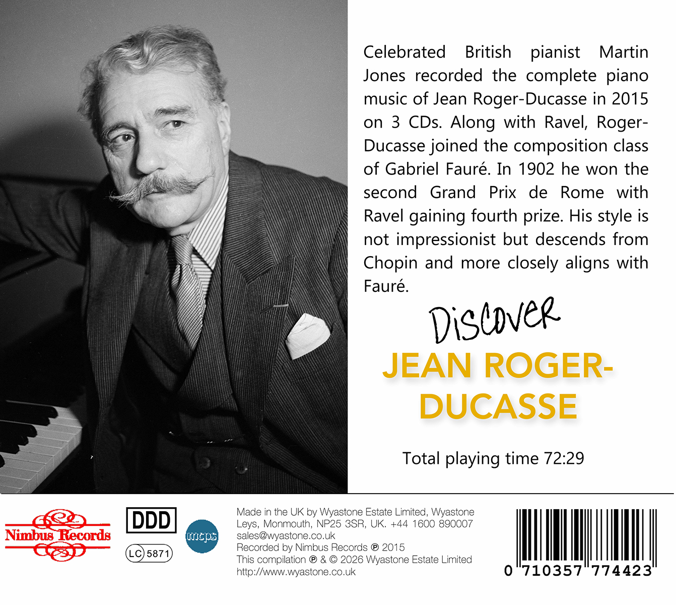 Jean Roger-Ducasse besuchte gemeinsam mit Maurice Ravel die Kompositionsklasse von Gabriel Fauré. 1902 errang er immerhin den zweiten Platz beim Grand Prix de Rome, während Ravel bekanntlich nur den vierten Preis erhielt (Aymé Kunc siegte mit seine Kantate „Alcyone”). Roger-Ducasses Stil ist nicht wirklich impressionistisch, sondern geht vielmehr auf Frédéric Chopin zurück und ähnelt eher dem Faurés. Der renommierte britische Pianist Martin Jones nahm im Jahr 2015 das gesamte Klavierwerk von Jean Roger-Ducasse auf. Das Album versammelt die wichtigsten und bedeutendsten Werke und bietet eine umfassende Einführung in das Schaffen dieses heute fast vergessenen französischen Meisters.