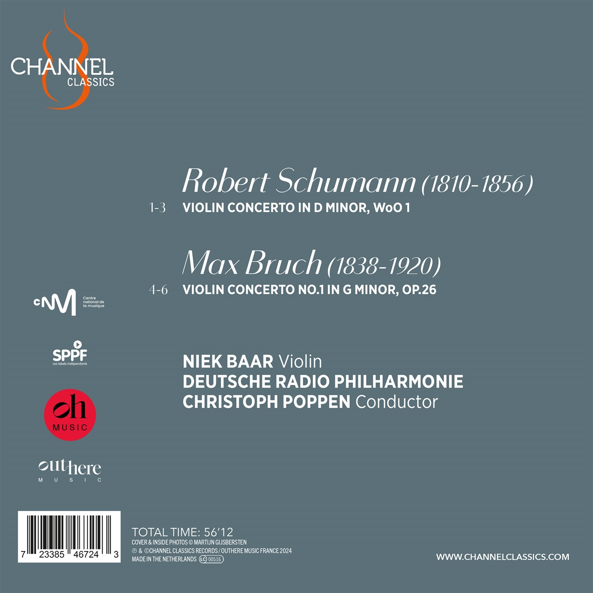 Der niederländische Geiger Niek Baar spielt gemeinsam mit der Deutschen Radio Philharmonie unter der Leitung von Christoph Poppen zwei klassische Violinkonzerte aus der Mitte des 19. Jahrhunderts. Robert Schumanns Violinkonzert in d-Moll und Max Bruchs Violinkonzert Nr.1 in g-Moll. Beide Violinkonzerte wurden für den legendären Joseph Joachim geschrieben, der die endgültige Form beider Werke mitgestaltete, obwohl seine Änderungen am Schumann-Konzert vom Komponisten letztlich abgelehnt wurden. Das höchst originelle, introvertierte und melancholische Konzert ist ein bewegendes Selbstporträt des 43-jährigen Schumann wenige Jahre vor seinem Tod, und Bruchs Nr. 1 gehört zu den beliebtesten Konzerten des gesamten Repertoires.