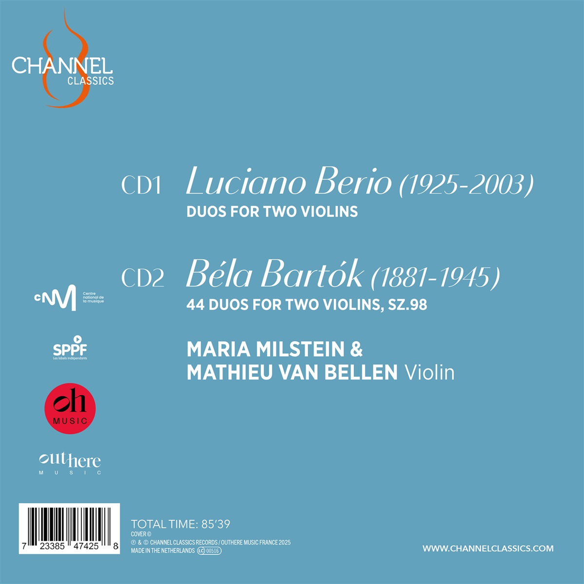 Maria Milstein und Mathieu van Bellen stellen Béla Bartóks 44 Duos für zwei Violinen den 34 Duetti per Due Violini von Luciano Berio gegenüber. Bartóks Miniatur-Meisterwerke haben unzählige junge Musiker inspiriert und begeistert. Obwohl sie für Kinder geschrieben wurden, sind diese Duos alles andere als kindisch: originelle Harmonien, auffallende Dissonanzen und lebhafte Rhythmen werden eingesetzt, um eine Musik mit emotionaler Tiefe zu schaffen, von der einige tragisch, andere grimmig, lyrisch, wild oder feurig sind. Nur wenige Werke fangen die Vitalität der Volksmusik so eindringlich ein wie diese. Wie Bartók komponierte Berio seine „Duetti“ als Lehrstücke und widmete jedes der 34 Duos einem Freund, Kollegen oder Komponisten, beginnend mit Béla, einer Hommage an Bartók. Die Stücke bieten ein Kaleidoskop von Stilen und spiegeln Berios persönliche Verbindungen zu den Widmungsträgern wider.