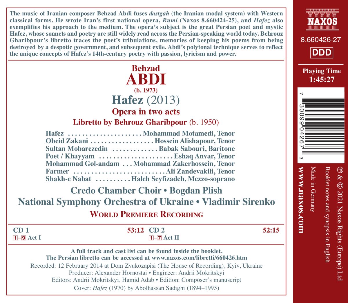 Die Musik des iranischen Komponisten Behzad Abdi (*1973) kombiniert das Modalsystem der persischen Kunstmusik „Dastgah“ mit klassisch-westlichen Formen. Abdi schrieb die erste iranische Nationaloper „Rumi“ (2009) und auch seine zweite Oper „Hafez“ (2013) ist ein gutes Beispiel für seine Kompositionstechnik. Der große persische Dichter und Mystiker Hafez (1315–1390), dessen Sonette und Gedichte noch heute in der persisch-sprachigen Welt viel gelesen werden, steht im Mittelpunkt des Werkes. Behrouz Gharibpours Libretto schildert die Irrungen und Wirrungen des Dichters, der versucht seine Gedichte vor der Zerstörung durch eine despotische Regierung zu bewahren. Abdi selbst lebt in der Ukraine, wo auch die Aufnahmen entstanden.