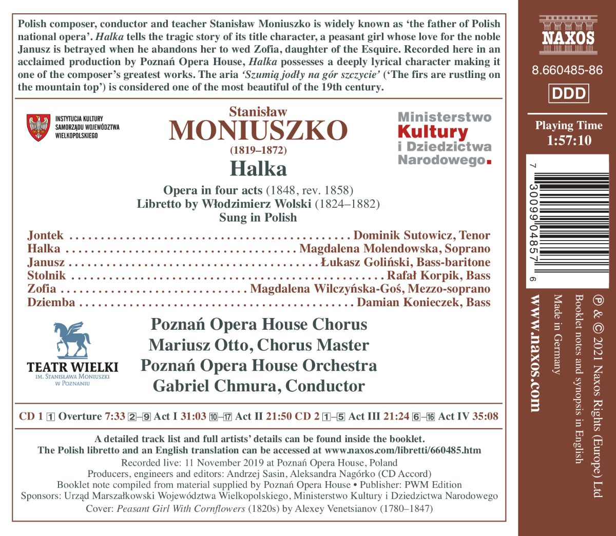 Stanis?aw Moniuszko (1819–1872) gilt als ‚Vater der polnischen Nationaloper‘. Seine Schaffenszeit fiel in eine Epoche, in der sich überall in Europa, speziell im Osten, nationale Kompositionstraditionen ausbildeten, die stolz die Kultur der Heimat reflektierten. Die Oper „Halka“ erzählt die tragische Geschichte des gleichnamigen Bauernmädchens, deren Liebe zu dem adligen Janusz verraten wird, als dieser sie verlässt, um Zofia, die Tochter des Landvogts, zu heiraten. Halka, die hier in einer Produktion des Opernhauses Posen aufgenommen wurde, besitzt einen zutiefst lyrischen Charakter, der sie zu einem der größten Werke des Komponisten macht.
