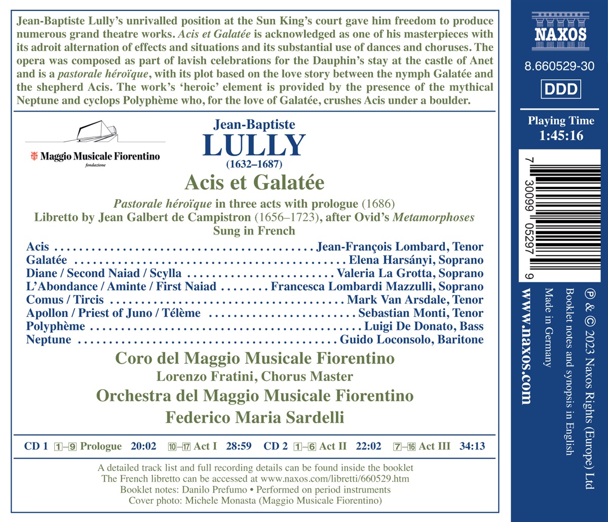 Im Frankreich des Sonnenkönigs Ludwig XIV. besaß Jean-Baptiste Lully einzigartige Rechte: Niemand durfte ohne seine Erlaubnis Opern aufführen. 1686 hatte sein Einfluss zwar schon abgenommen, jedoch komponierte er mit „Acis et Galatée“, einer Pastorale-héroïque (diese Gattung hatte der Komponist selbst erfunden), eins seiner letzten Meisterwerke. Die Handlung – der Zyklop Poliphème liebt die Nymphe Galatée – inspirierte Lully zu außergewöhnlichen Effekten, einem tiefsinnigen Monolog an die Nymphe im 3. Akt und einer großartigen Passacaille am Ende, dazwischen einer Reihe von Tänzen und lebhaften Chören.