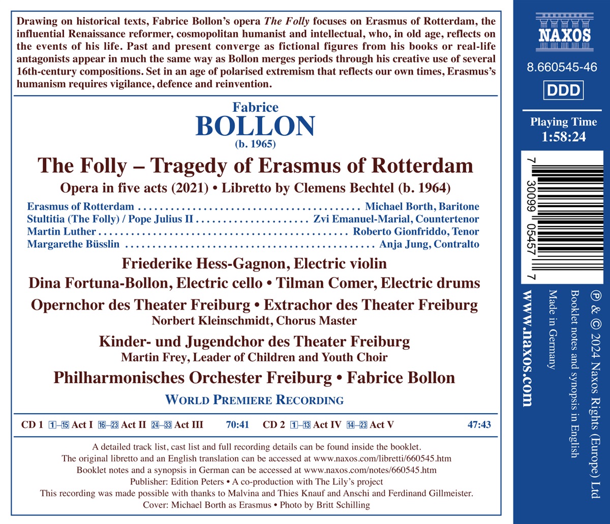 Fabrice Bollons auf historischen Texten basierende Oper „The Folly“ erzählt die Geschichte von Erasmus von Rotterdam, dem einflussreichen Reformator der Renaissance, Humanisten und kosmopolitischen Intellektuellen, der im hohen Alter über die Ereignisse seines Lebens nachdenkt. Vergangenheit und Gegenwart verschmelzen, als fiktive Figuren aus seinen Büchern oder reale Antagonisten auftauchen. Fabrice Bollon unterstützt diese Verschmelzung durch die kreative Verwendung verschiedener Kompositionen aus dem 16. Jahrhundert, die die Epochen miteinander verbinden. Erasmus‘ Leben wird zu einer Parabel unserer Zeit und ist ein entschiedenes Plädoyer für den Humanismus den Erasmus geprägt hat.