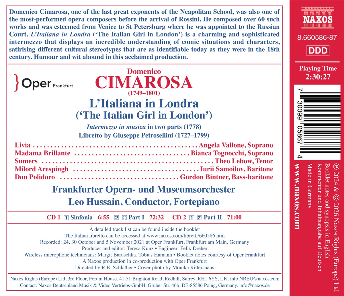 Domenico Cimarosa, einer der letzten großen Vertreter der neapolitanischen Schule, war vor Gioachino Rossini einer der meistgespielten Opernkomponisten. Er komponierte über 60 Werke und wurde von Venedig bis St. Petersburg geschätzt, wo er an den russischen Hof berufen wurde. „L’Italiana in Londra” ist ein charmantes und raffiniertes Intermezzo, das ein unglaubliches Verständnis für komische Situationen und Charaktere zeigt und verschiedene kulturelle Stereotypen satirisiert, die heute genauso erkennbar sind wie im 18. Jahrhundert. Humor und Witz sind in dieser gefeierten Produktion reichlich vorhanden. Diese Aufnahme war zunächst auf DVD und Blu-ray erhältlich. ‚Die glamouröse (sowohl optisch als auch stimmlich) Angela Vallone als Livia brilliert sowohl in ihrer amourösen Sehnsucht als auch in ihrer feurigen Empörung. Ihre Sopran-Kollegin Bianca Tognocchi mit ihrer hellen Stimme verleiht der Rolle der wissenden, alles gesehenen Brillante komödiantischen Schwung’, schrieb Gramophone. Der Dirigent Leo Hussain hat für berühmte Opernhäuser in ganz Europa gearbeitet, darunter die Semperoper Dresden und das Royal Opera House, Covent Garden.