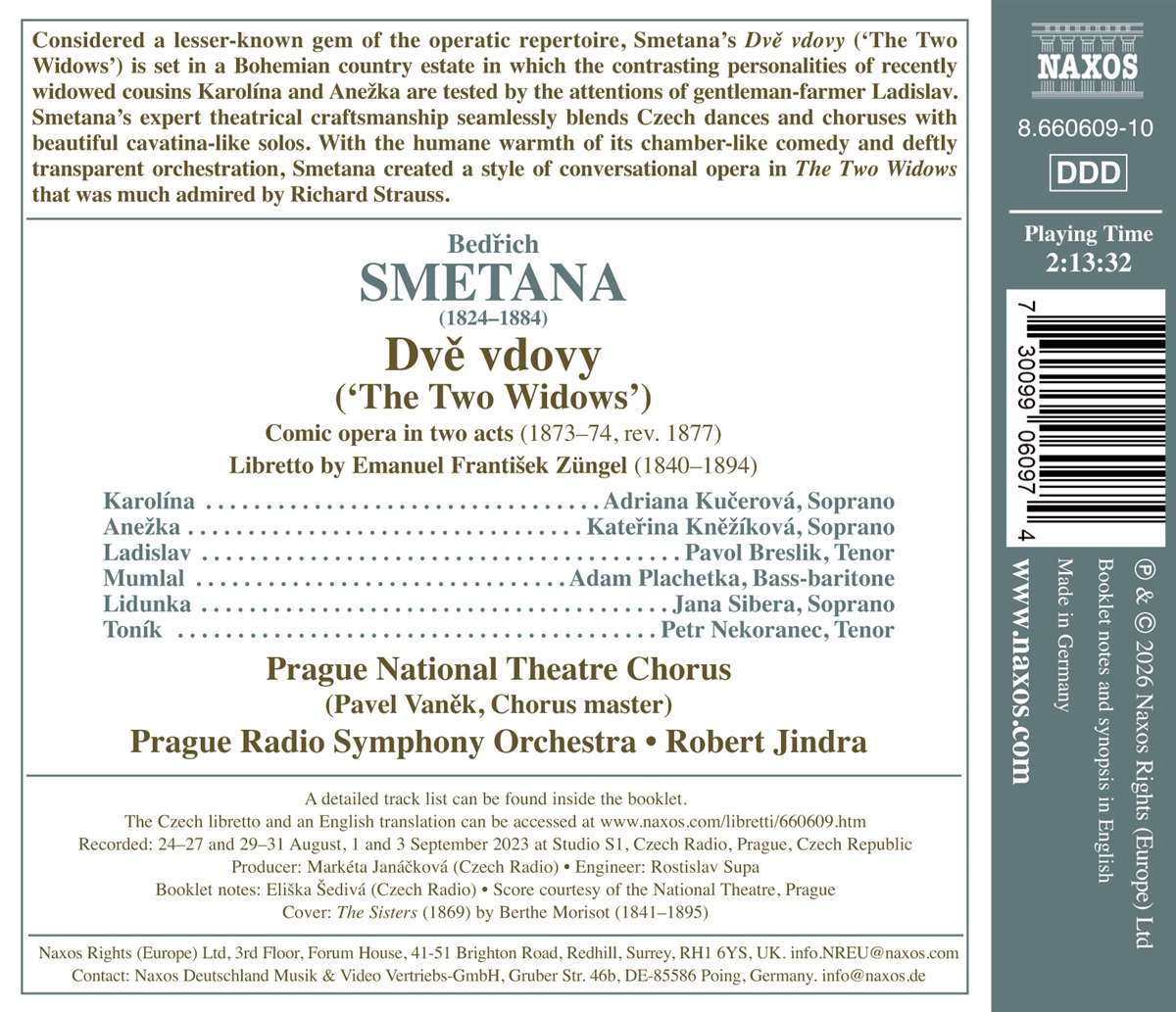 Bedřich Smetanas „Dvě vdovy“ (Zwei Witwen) gilt als weniger bekanntes Juwel des Opernrepertoires. Die Handlung spielt auf einem böhmischen Landsitz, wo die gegensätzlichen Persönlichkeiten der kürzlich verwitweten Cousinen Karolína und Anežka durch die Aufmerksamkeiten des Gutsherrn Ladislav auf die Probe gestellt werden. Smetanas meisterhaftes theatralisches Handwerk verbindet nahtlos tschechische Tänze und Chöre mit wunderschönen, cavatinaartigen Soli. Mit der menschlichen Wärme seiner kammermusikalischen Komödie und seiner geschickt transparenten Orchestrierung schuf Smetana in „Zwei Witwen“ einen Stil der Konversationsoper, der von Richard Strauss sehr bewundert wurde. Etwas überschattet von der extrovertierteren „Die verkaufte Braut“ ist Smetanas „Zwei Witwen“ bisher nur in vollständiger Form auf einigen wenigen Aufnahmen des Labels Supraphon vertreten gewesen. Die vorliegende neue Veröffentlichung wird die Wertschätzung für eine schöne und innovative Oper erweitern, die einen frühen Präzedenzfall für Bühnenwerke geschaffen hat, deren Erzählfluss sich aus der natürlichen Sprachmelodie ergibt und nicht durch große Arien und Versatzstücke unterbrochen wird. Robert Jindra, der Chefdirigent der Staatsphilharmonie Košice und seit 2022 Musikdirektor des Nationaltheaters in Prag dirigiert das Prague Radio Symphony Orchestra.