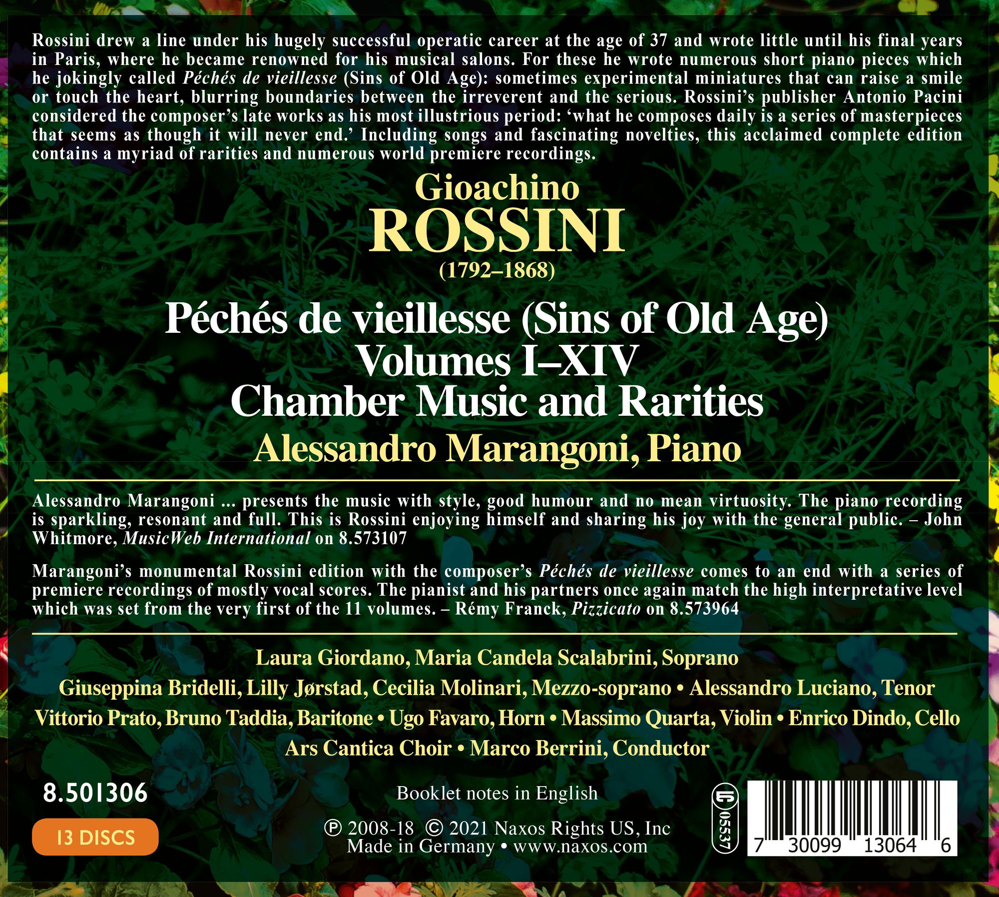 Gioachino Rossini zog sich im Alter von gerade einmal 37 Jahren 1829 von der Opernbühne zurück und komponierte nur noch sporadisch. Ab 1857 entstanden die „Péchés de vieillesse“ (‚Alterssünden’), die Rossini in 13 Bänden und zwei Supplements sammelte, jedoch nicht zu Lebzeiten nicht veröffentlichte. Zwischen 2008 und 2018 widmete sich der Pianist Alessandro Marangoni der Gesamtaufnahme der Péchés. Diese enthalten die vollständige Klaviermusik Rossinis (etwa 100 geistvolle und hintergründige Miniaturen) und darüber hinaus rund fünfzig weitere Stücke für wechselnde Kammerbesetzungen. Die 11 Volumina der Reihe gibt es jetzt als vollständige Box mit den Originalcovers und Booklets.