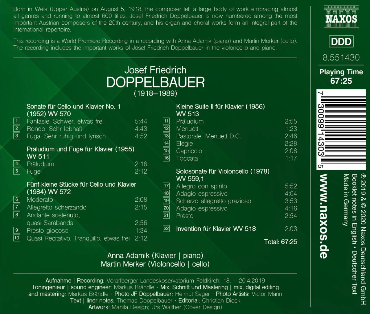 32 Jahre trennen die ältesten von den jüngsten Kompositionen auf diesem Album mit ausgewählten Werken für Cello und Klavier. Sie decken ein breites Spektrum von Doppelbauers stilistischer Bandbreite ab. Von schicksalhafter Schwere bis hin zu elegischer Leichtigkeit und zärtlicher Zurückhaltung, von lebhaften Kontrasten und lyrischer Melancholie bis hin zu strenger Ordnung: Doppelbauers Musik erweist sich als äußerst abwechslungsreich und stets kunstvoll gestaltet.