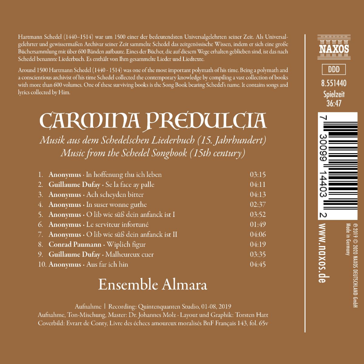 Das Ensemble Almara hat einige Lieder aus dem Liederbuch mit Kompositionen Guillaume Dufays und Conrad Paumanns – zwei Zeitgenossen Schedels – zum Album „Carmina Predulcia“ (etwa ‚allerlieblichste Liedsammlung‘) zusammengefasst.