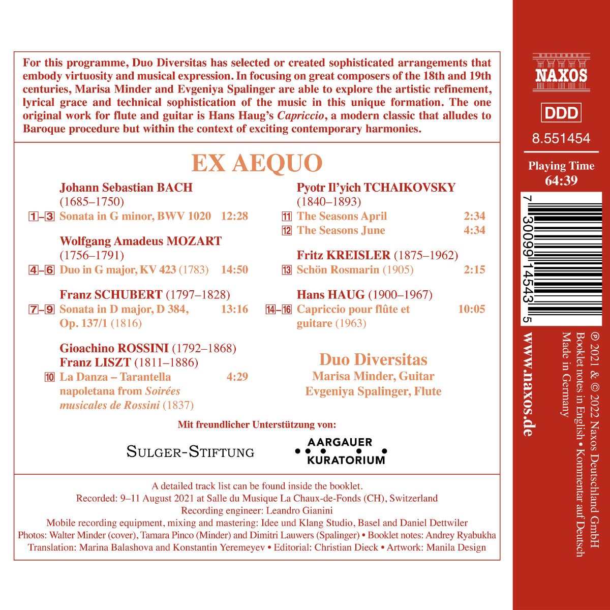 Für dieses Programm hat das Duo Diversitas anspruchsvolle Arrangements ausgewählt oder selbst geschaffen, die Virtuosität und musikalischen Ausdruck verkörpern. Marisa Minder und Evgeniya Spalinger konzentrieren sich auf große Komponisten des 18. und 19. Jahrhunderts und erforschen die Raffinesse, Anmut und technischen Möglichkeiten von Gitarre und Flöte. Das einzige Originalwerk für diese Kombination ist Hans Haugs „Capriccio“, ein moderner Klassiker, der auf barocke Verfahren anspielt, aber im Kontext aufregender zeitgenössischer Harmonik.